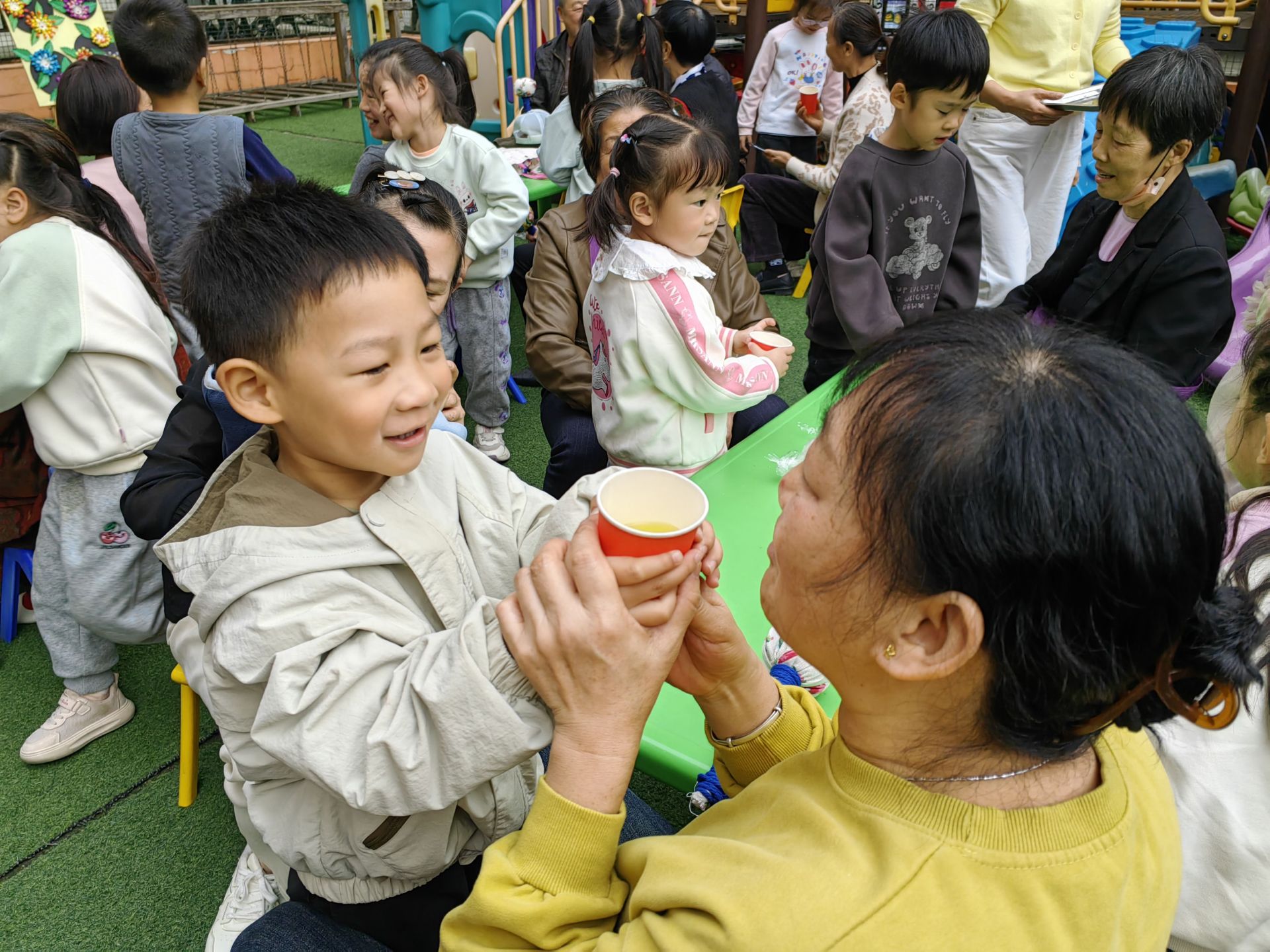 最暖心的环节当属“敬茶礼”。孩子们端着温热的菊花茶,走到特意邀请来的爷爷奶奶面前。先恭恭敬敬地鞠个躬,双手捧起茶杯举过头顶:“爷爷奶奶,重阳节快乐!您尝尝这个茶,喝了不口干~”老人们笑得眼角堆起皱纹,接过茶杯喝了又喝,拉着小家伙的手不停念叨“我们娃长大了,懂事喽”。
