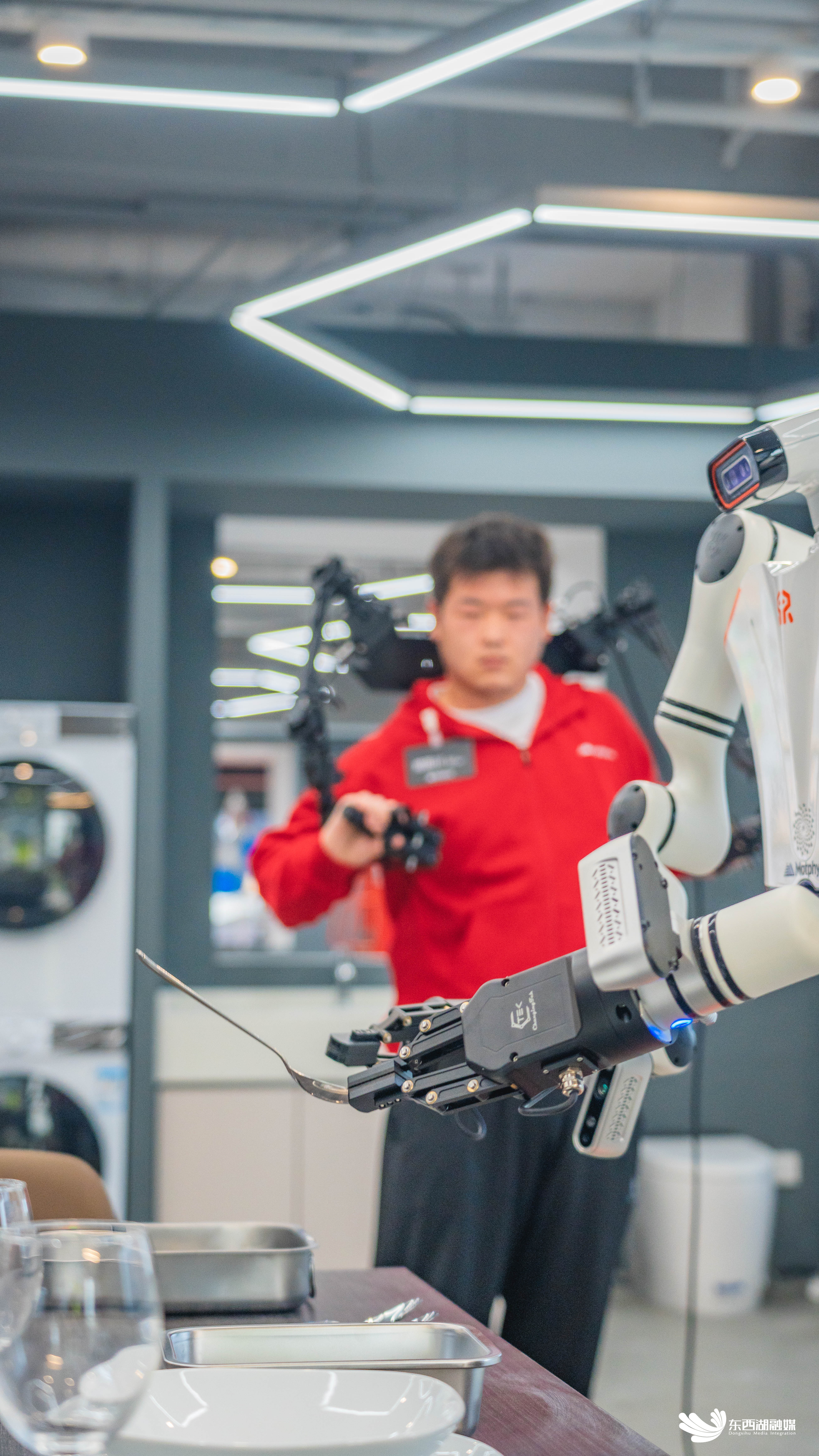 在厨房场景,机器人认真学习抹桌子做保洁。