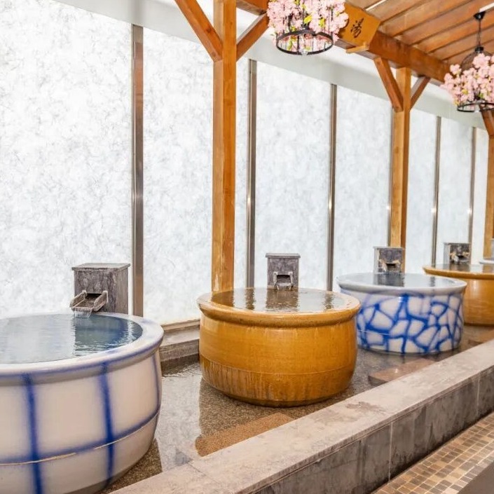 一层泡汤区,五大软水风吕静候。壶风吕独享私密,按摩风吕驱散压力,电气风吕对抗酸胀,碳酸风吕促进循环,美肌风吕润泽肌肤。每一池,都是与自我的一场对话。