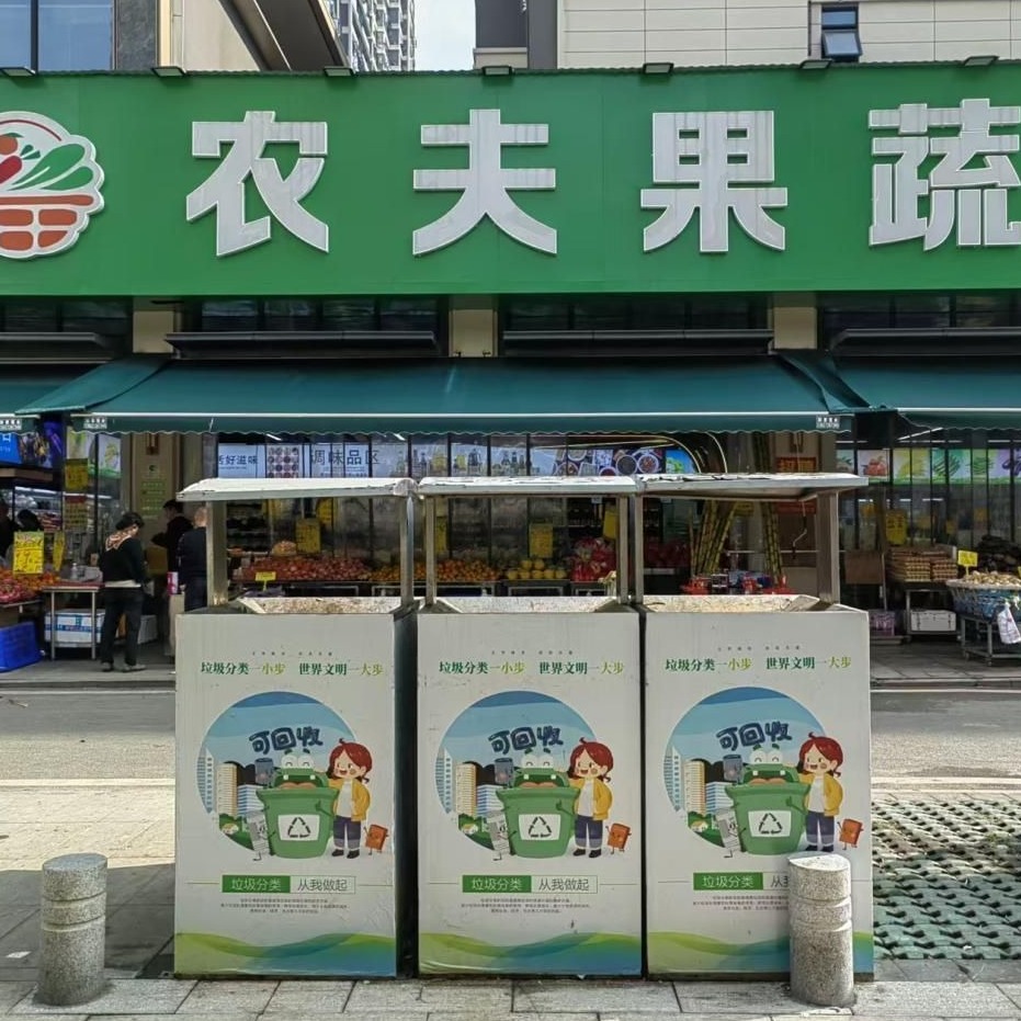 据了解,针对两条商业街的不同业态与场地条件,环卫部门采取了“一地一策”的分类设施布局方案。保利锦上印商业街地域开阔且绿化带分布较广,便于集中设置分类点位,因此专门搭建了4座垃圾分类亭,为商户和居民提供固定、规范的投放空间;美联奥公馆商业街因场地狭窄,不便建设大型亭体,则因地制宜配置了4组垃圾分类桶,实现空间利用与分类需求的精准匹配。