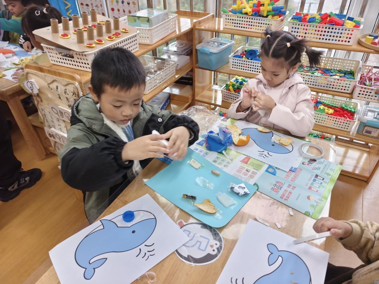 一旁的垃圾分类转盘前也排起了长队,孩子们转动彩色转盘,指针定格的瞬间立刻抢答分类结果,反应快的还主动当起“小裁判”,帮同伴纠正小失误。最令人惊喜的是“变废为宝”手工环节,孩子们用巧手赋予废弃物新生,在亲身实践中深刻理解了“垃圾是放错位置的资源”。