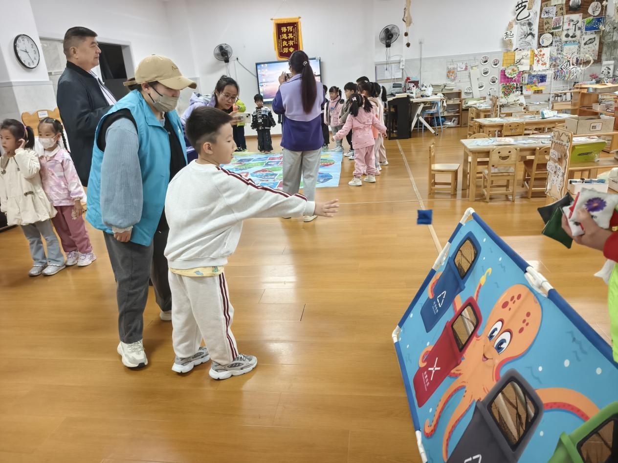 “垃圾分类大闯关”环节一开启,幼儿园的活动区立刻变身“欢乐战场”。投沙包区里,孩子们瞄准贴有“厨余垃圾”“可回收物”等标识的垃圾桶模型,攥紧写有垃圾名称的沙包,屏气凝神投掷——“耶!香蕉皮投中绿桶啦!”投中者蹦着欢呼,没投中的小朋友也不气馁,在专班叔叔的提示下重新瞄准,直到精准投中才满意地跑向下一关。