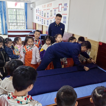 在消防科普区,师生们参观了消防员的宿舍、活动室,整齐划一的“豆腐块”被子、干净整洁的环境让孩子们深受触动,消防员叔叔还现场教学叠被子技巧,传递自律有序的生活习惯。随后,消防员通过趣味问答、情景模拟等方式,讲解了火灾报警电话“119”、火场逃生注意事项、家庭防火小常识等关键内容,让孩子们在互动中轻松掌握安全知识。