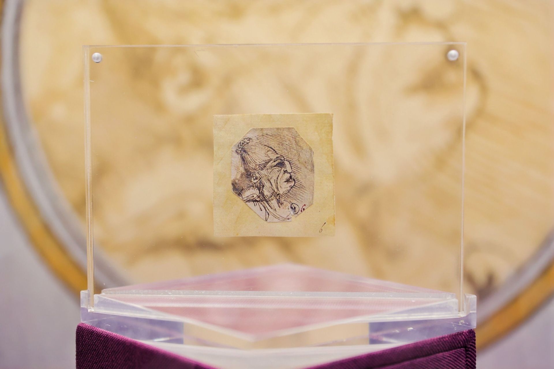 展览中最重磅的展品之一是“梅加拉”手绘画碎片真迹。这份手稿残片创作于1490-1510年间,是达·芬奇用金属尖笔与棕褐色墨水在直纹纸上勾画的一位侧脸老妇人(“梅加拉”)的肖像。手稿残片为不规则的八边形,稿中线条采用从右下至左上的斜向排线风格,是达·芬奇手笔的标志。作品展现了达·芬奇对捕捉夸张人类表情和独特面部特征的痴迷。据了解,手稿是在一本罕见的1651年版《绘画论》的暗袋中发现的。达·芬奇去世后,文艺复兴时期艺术收藏家庞培·莱奥尼曾负责整理其大部分散落的手稿,习惯将小型肖像残片裁成特殊形状编入不同的收藏集中。