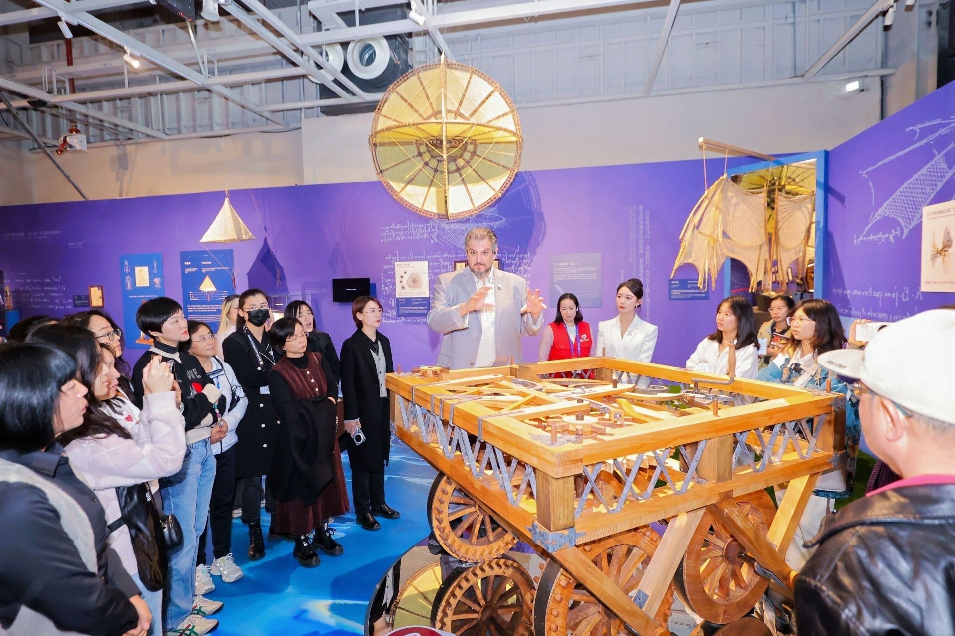 意大利列奥纳多达芬奇学院 马里奥·塔代伊教授介绍达芬奇展展品。