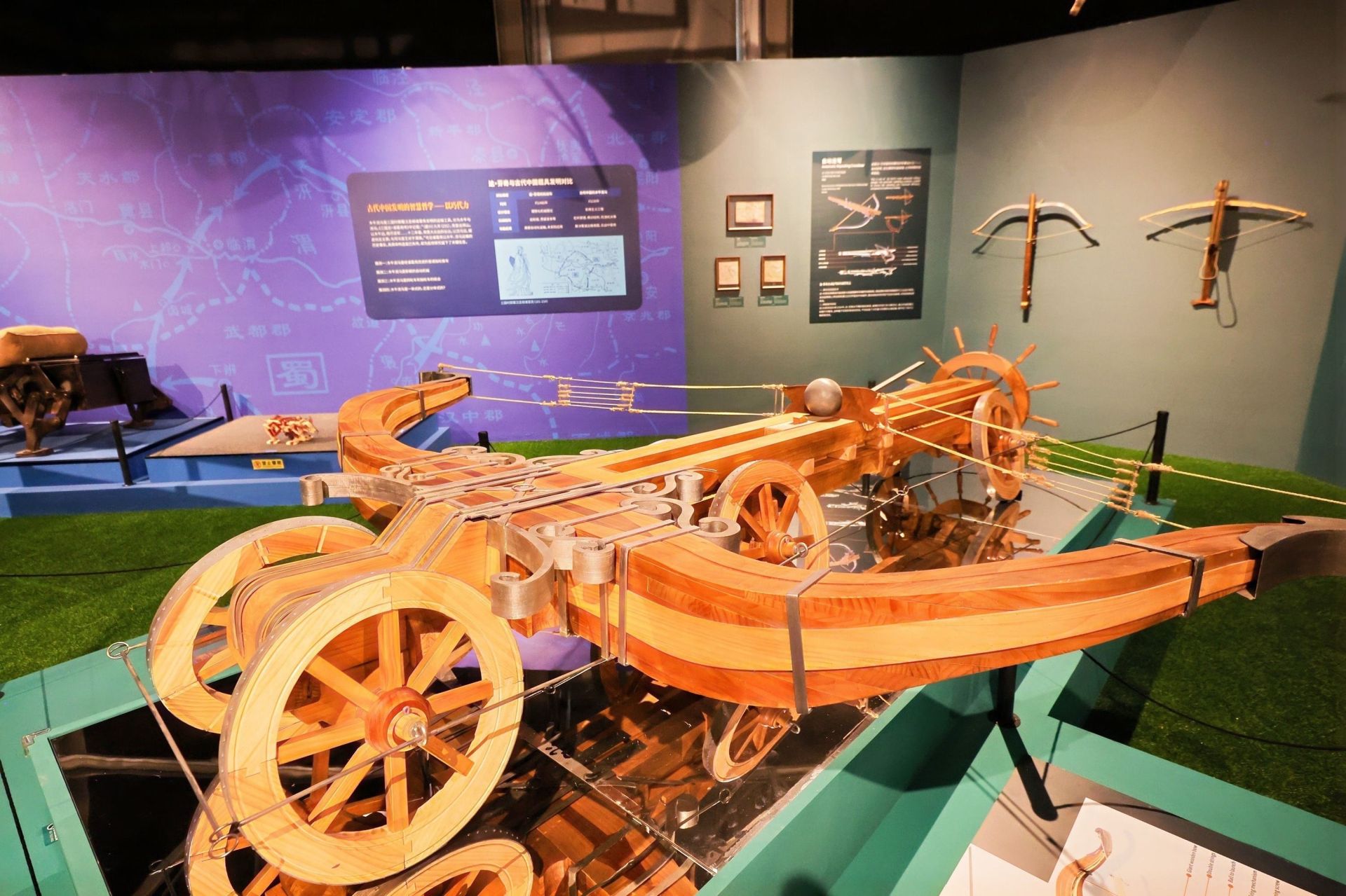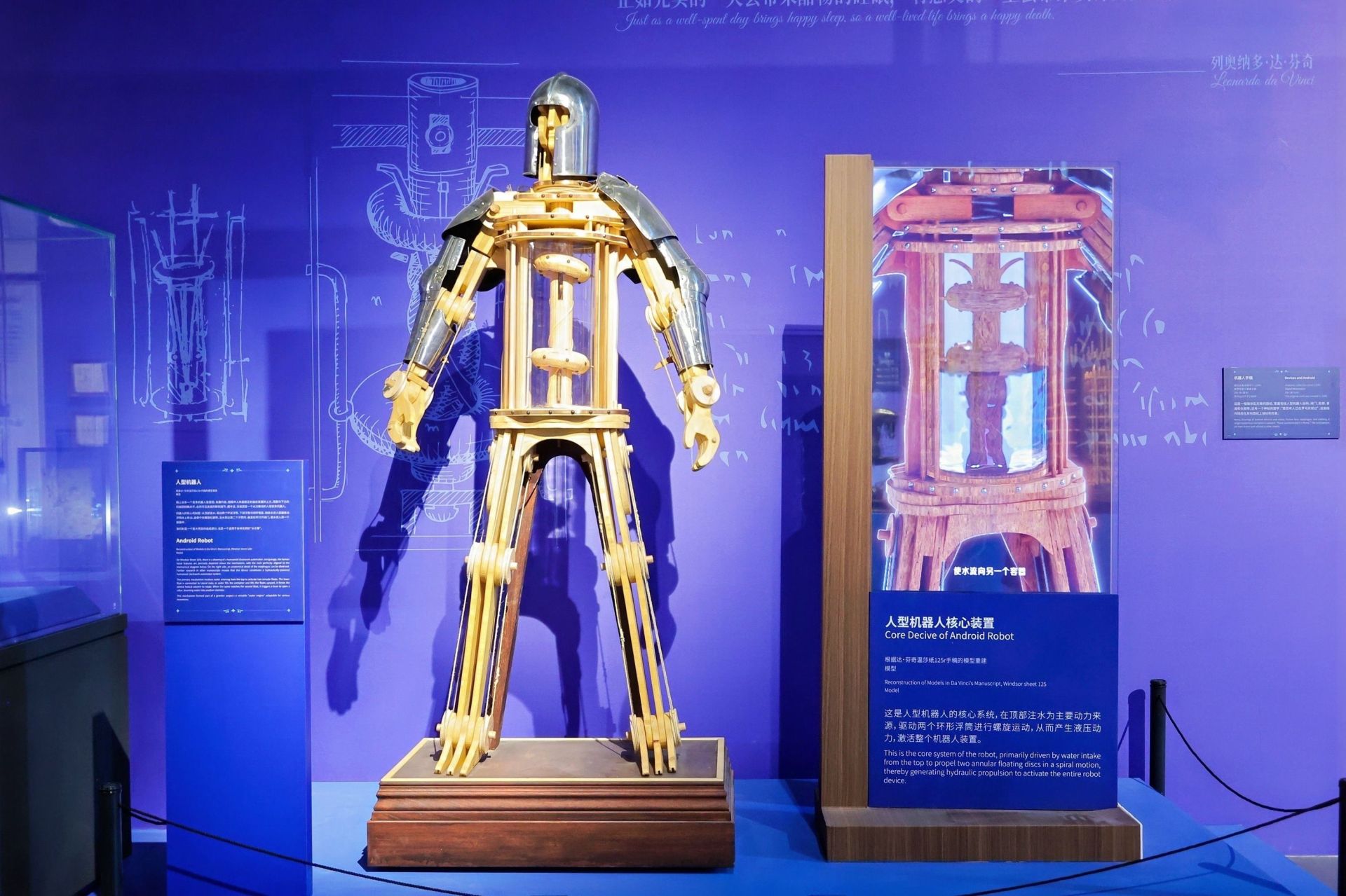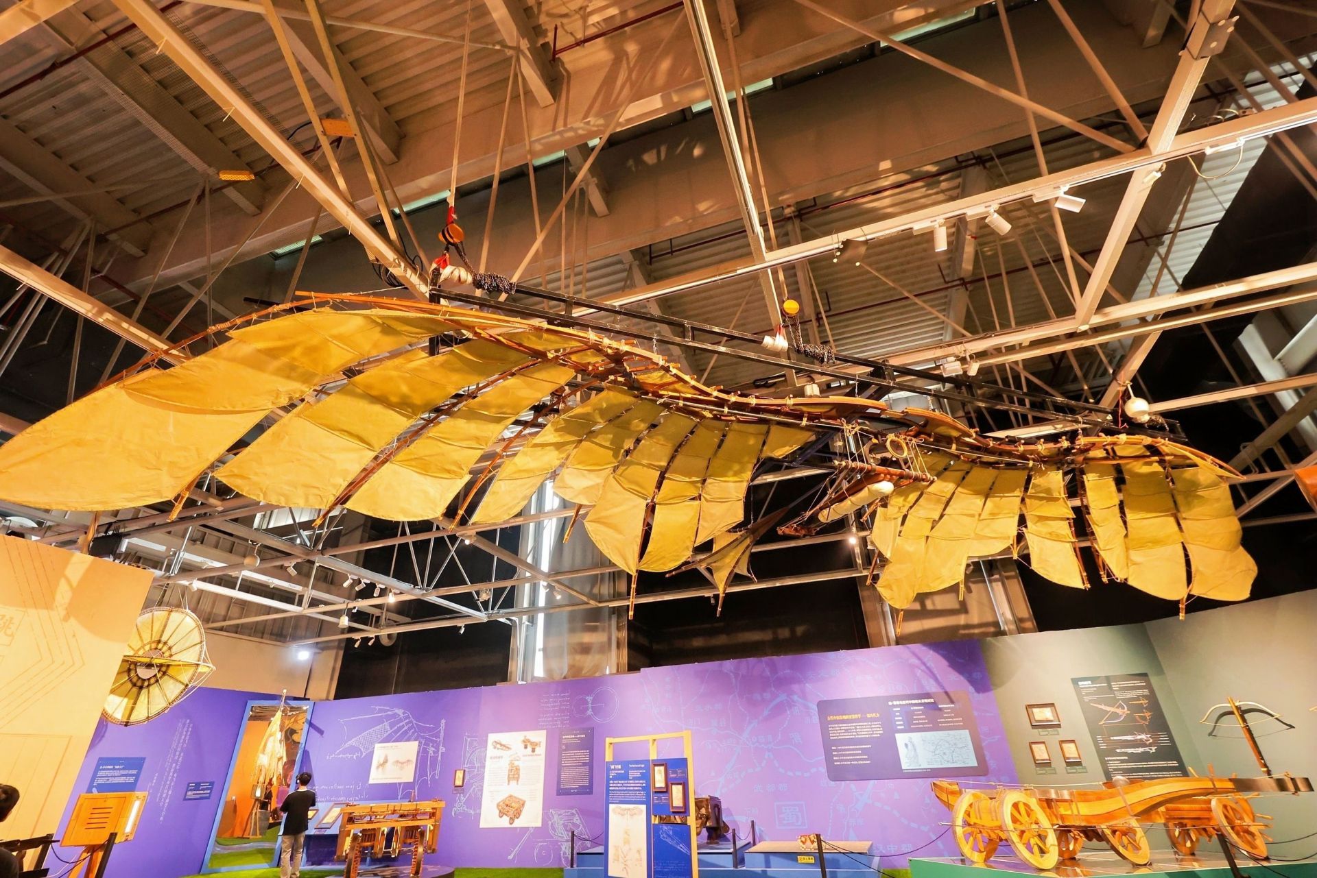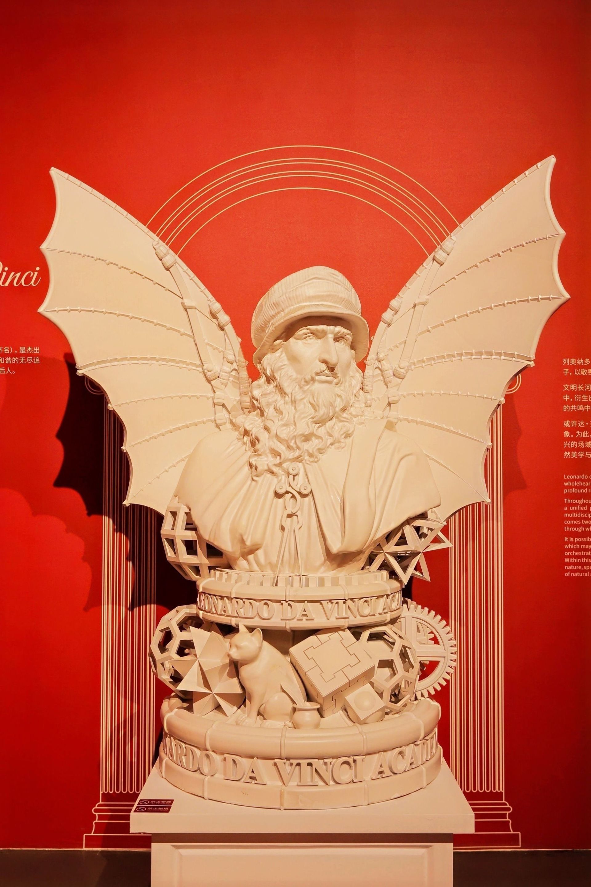 展览还展现了达·芬奇在雕塑、建筑、科学、工程、解剖学、音乐等多个领域创造出卓越成就。依据达·芬奇手稿重构的模型《机械狮子》,能模仿木偶的步态,由巨大的发条和带爪钩的绳索,在循环结构中来回移动,而且还能自动打开胸膛,撒落百合花。模型《飞鹰飞行器》是达·芬奇受飞鹰启发设计的飞行器模型。飞行员可通过脚踏板与绳索发力,使机械翼旋转或弯曲,同时还可用头与手操控翼面与尾翼的开合。