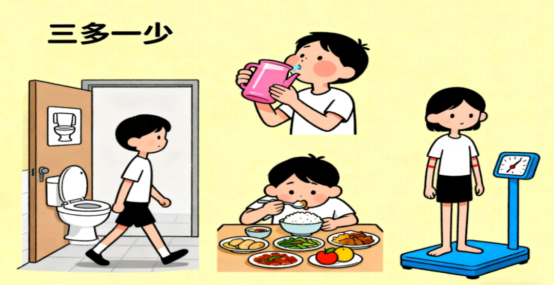 糖尿病典型的症状表现为“三多一少”,即多饮、多食、多尿、体重减轻。