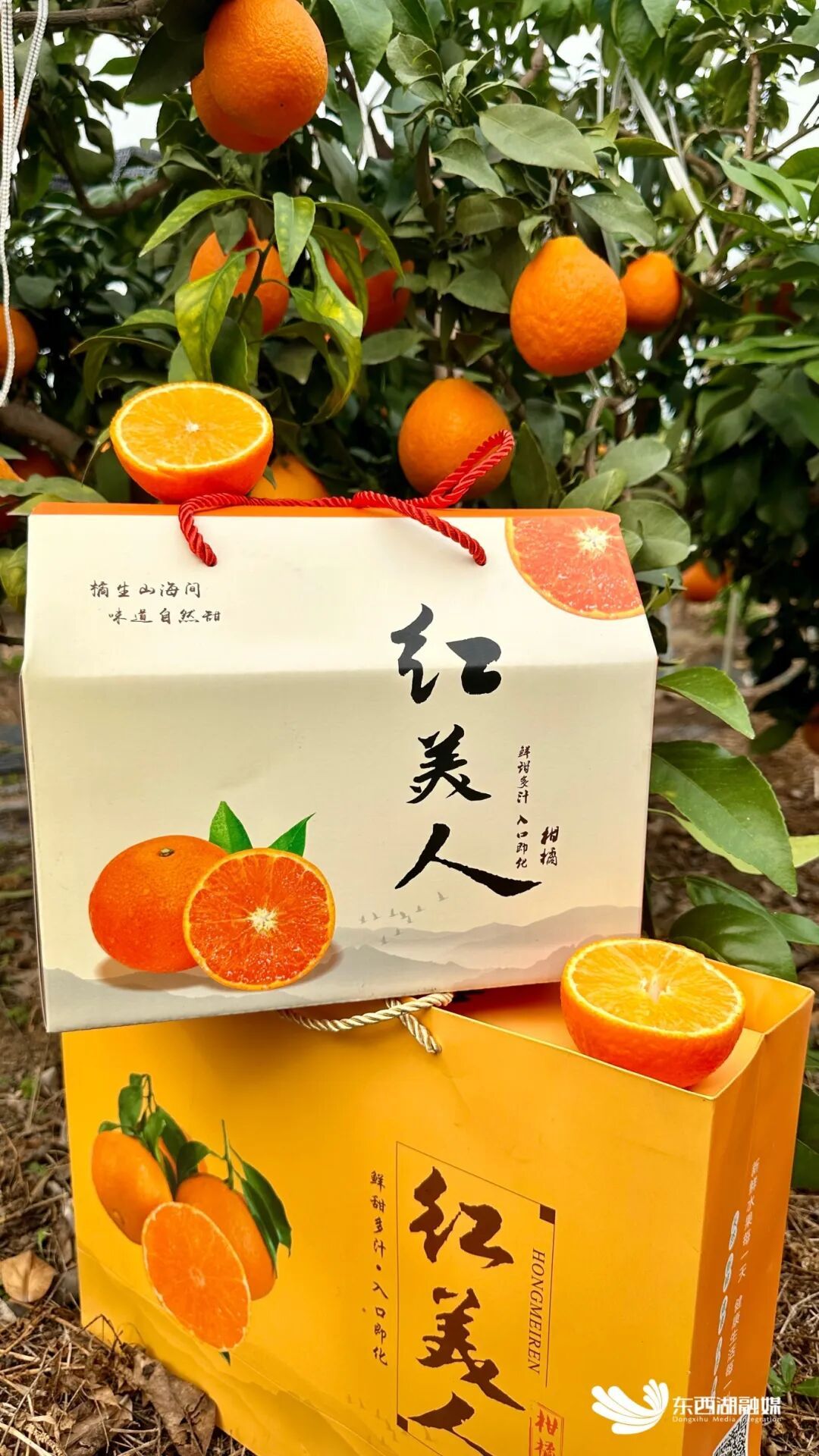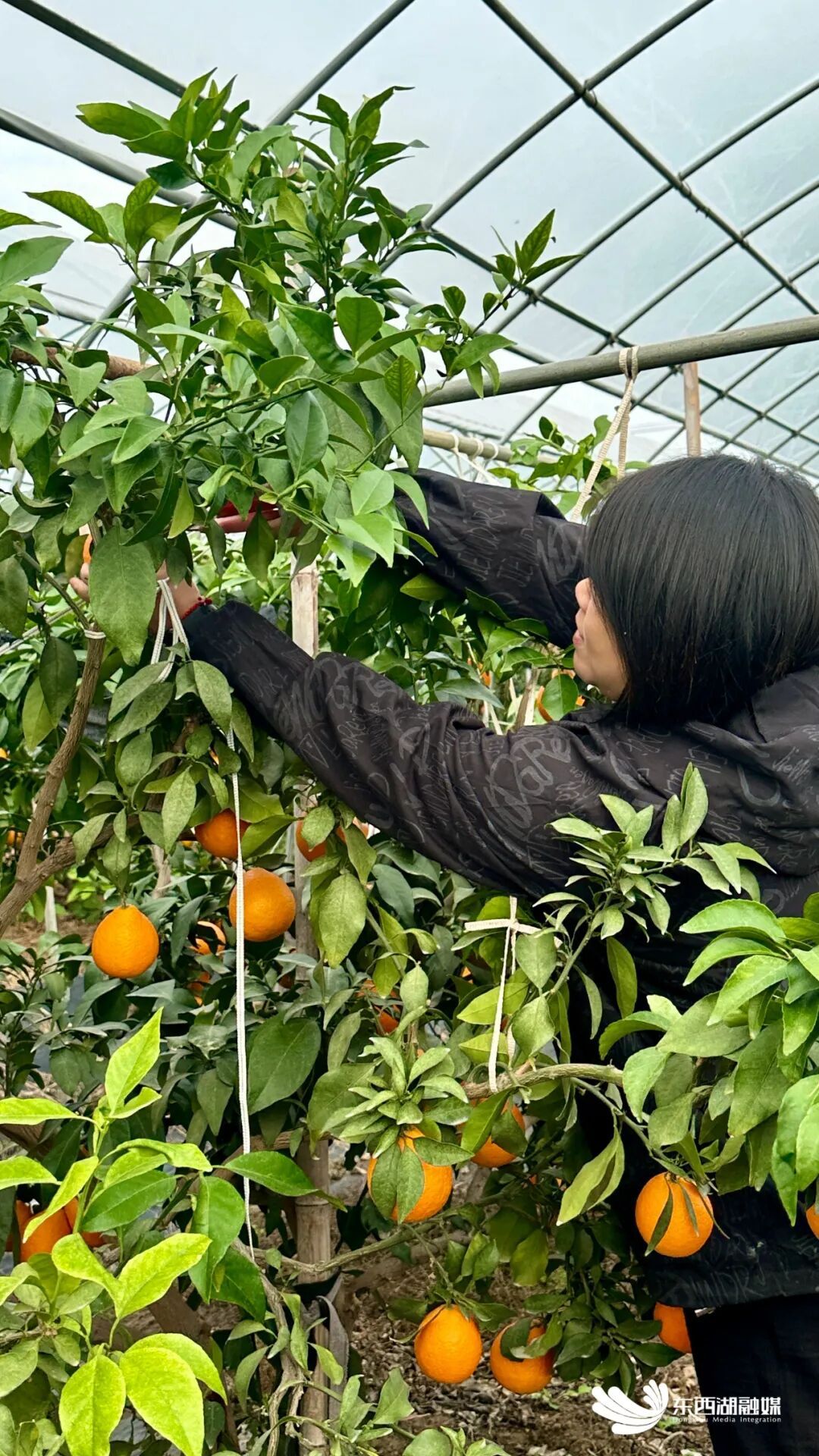 果园内,整齐排列的果树上,挂满圆润饱满的“红美人”,在阳光下泛着金黄光泽,犹如一盏盏小灯笼。随手摘下一颗,果皮薄软,指尖轻触便能感受到果肉中充盈的汁水。