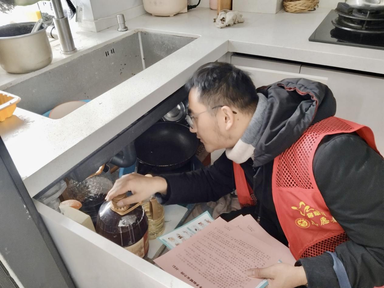 工作人员在老人家中对厨房灶具进行安全检查