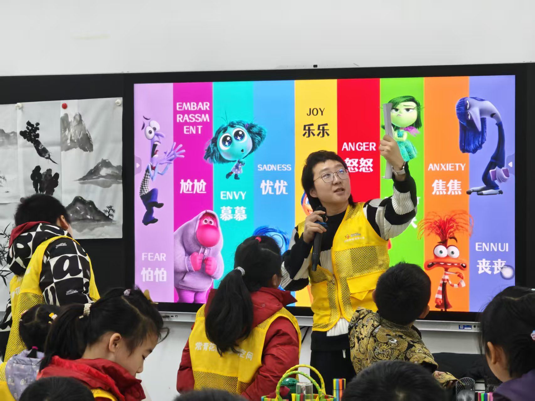 当孩子们对焦虑有了切身感受后,老师引入了《头脑特工队2》的电影片段。影片中,“焦焦”这个新角色引起了大家的特别关注。与传统认知不同,电影里的“焦焦”并非简单的麻烦制造者。它会在主人公面对新挑战时出现,虽然带来紧张感,却也促使她提前准备、仔细思考。这种新颖的诠释让孩子们睁大了眼睛。