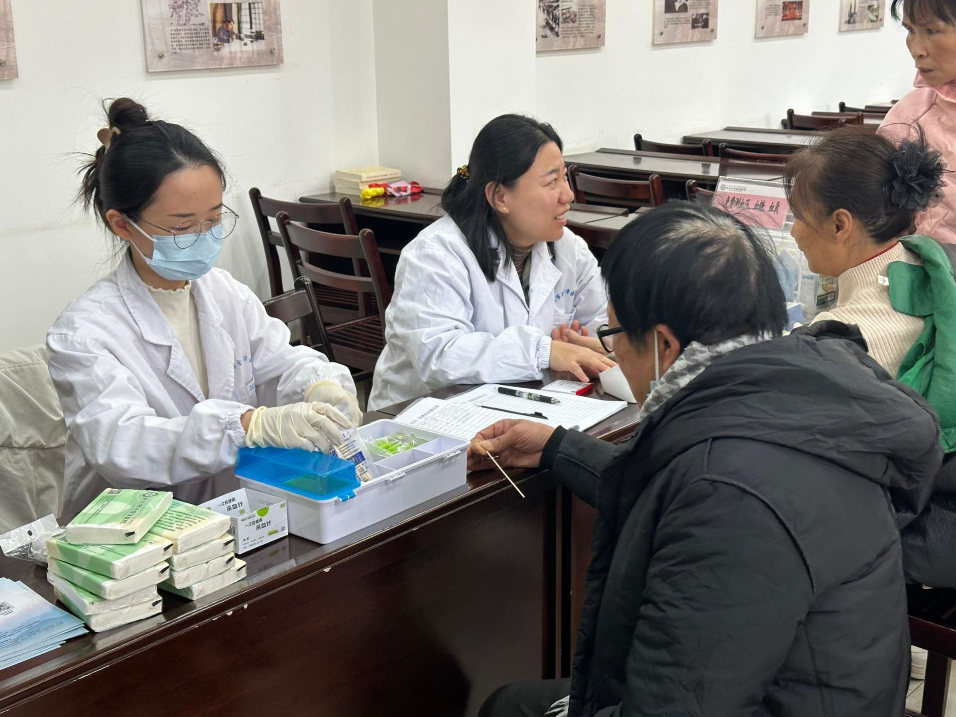 上午9点半,义诊活动正式开始。登记台前,居民秩序井然,志愿者耐心引导,金银潭医院的医护人员亲切接诊每位居民,以其扎实的理论功底和丰富的临床经验,提供专业诊疗意见和小妙招,现场提供量血压、测血糖、脑科问诊等健康服务。