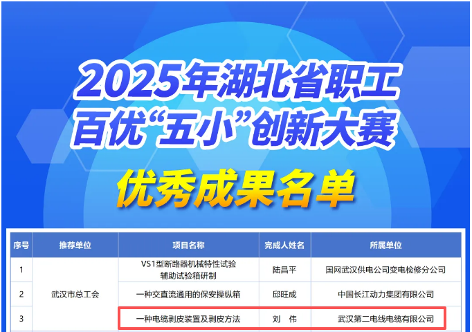 2025年,湖北省总工会联合省科技厅、省人社厅、省妇联、省科协共同开展2025年湖北省职工百优“五小”(小发明、小革新、小改造、小设计、小建议)创新大赛。经基层申报、各市州(大企、产业)工会初审推荐、专家评审等程序,产生100项优秀“五小”成果,其中,位于东西湖区的武汉第二电线电缆有限公司《一种电缆剥皮装置及剥皮方法》“五小”优秀成果上榜,该“五小”优秀成果由机械技术岗主任工程师刘伟主导完成。