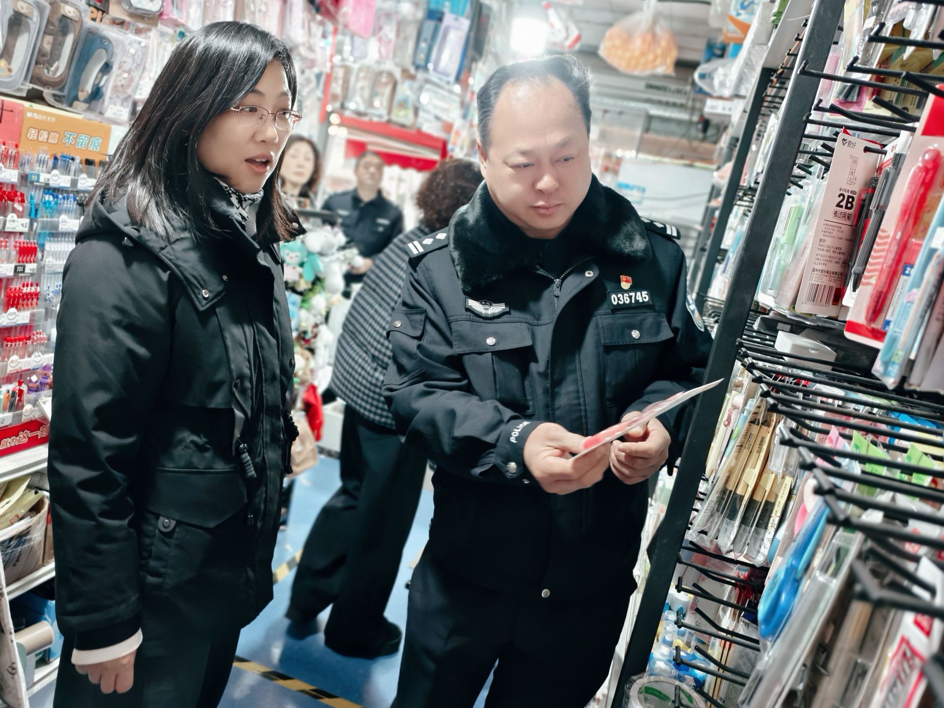 随后,检查组来到吴家山第四小学校门口的两家文具店,围绕禁鞭工作展开“地毯式”排查,逐一仔细翻看货架上的商品,不放过任何一个角落,认真核查是否存在售卖鞭炮、摔炮、擦炮等易燃易爆物品的情况。在排查过程中,警官还向店主积极宣讲禁鞭相关法律法规,详细解读非法售卖烟花爆竹将面临的法律后果,让店主充分认识到禁鞭工作的重要性和严肃性。社区书记易枫同志向店主再三强调并明确了个体户应承担的责任与义务,督促店主自觉遵守禁鞭规定,共同为校园周边营造安全和谐的环境。