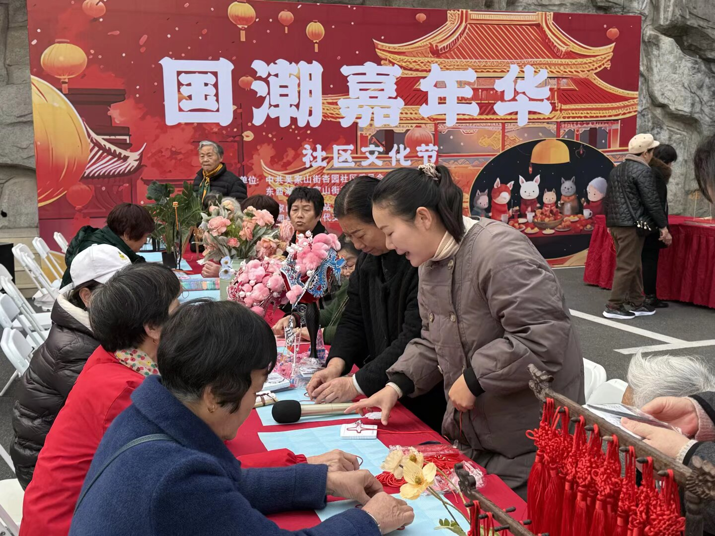 传统文化体验区同样精彩纷呈。中国结编织摊位上,志愿者耐心讲解穿、绕、编、抽的技法,居民们跟着步骤认真操作,一根根红绳在指尖灵动穿梭,逐渐变成寓意吉祥的中国结。大家互相交流技巧,分享成果,现场氛围温馨融洽。