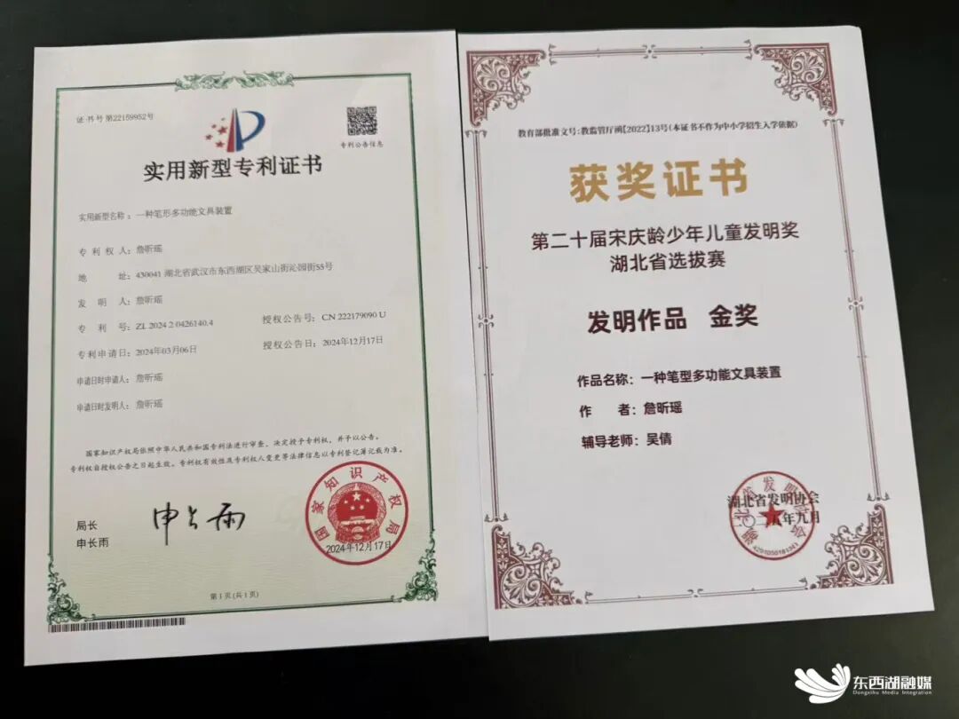 东西湖融媒从区教育局获悉,一支由武汉市吴家山中学学生设计制作的“一种笔形多功能文具装置”,在第二十届宋庆龄少年儿童发明奖湖北选拔赛中脱颖而出,斩获金奖,并成功获得国家实用新型专利证书。