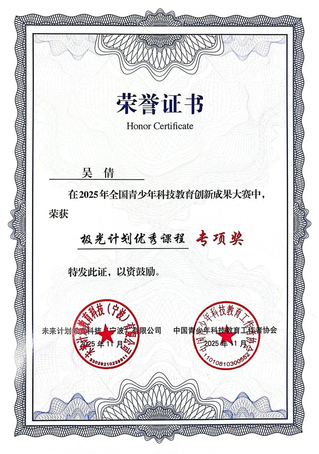 吴倩获荣誉证书。