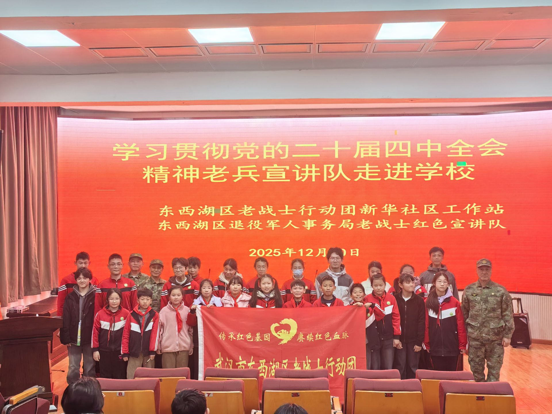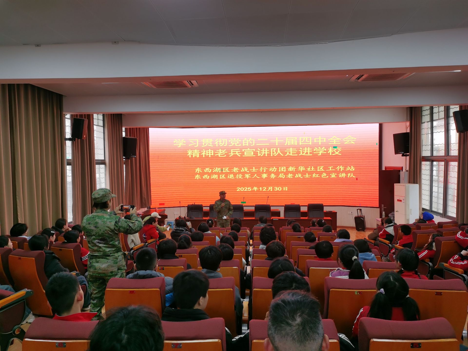 为深入学习宣传贯彻党的二十大及二十届四中全会精神,落实理论宣讲“五进”工作要求,紧扣关工委立德树人根本任务,引导广大青少年坚定理想信念、赓续红色血脉,12月30日,在东西湖区退役军人事务局和走马岭街道办事处党建办统筹部署下,老战士行动团新华社区工作站携手东方红中学、东方红小学及华龙生物制药公司,于东方红中学成功举办“学习贯彻党的二十大精神,传承红色基因,凝聚奋进力量”主题宣讲教育活动。