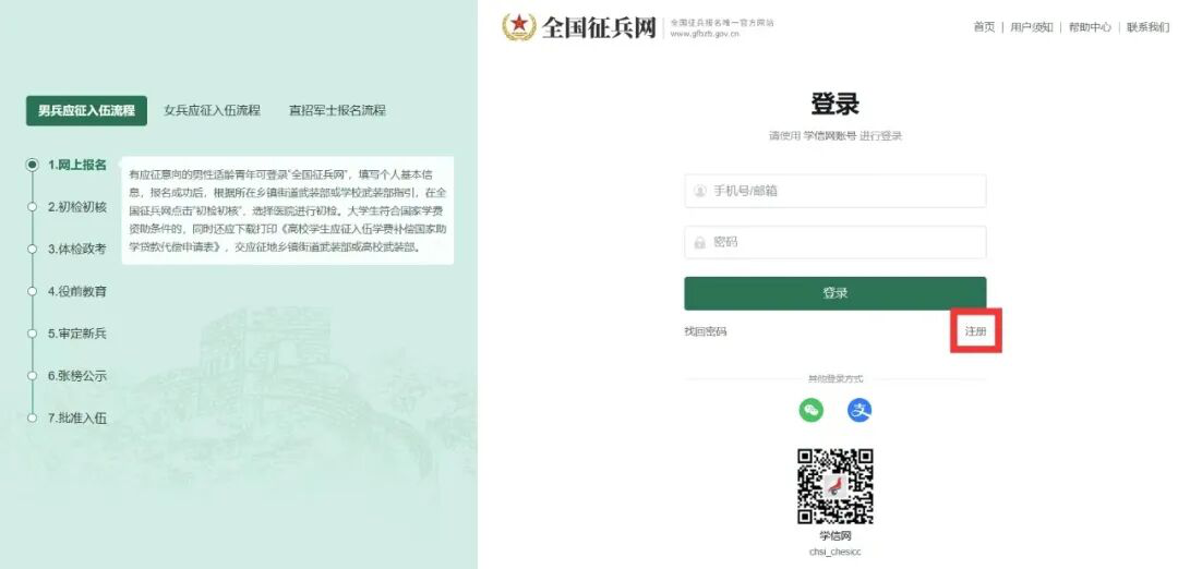 已在学信网注册过账号的,输入账号密码点击“登录”即可;未注册过账号的则点击“注册”。注册学信网账号必须实名,务必要用真实姓名和身份证认真填写,兵役机关将对有效信息进行审核。