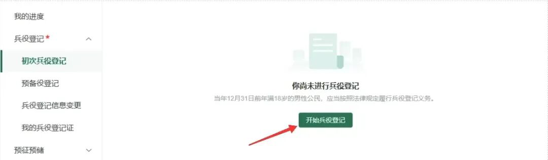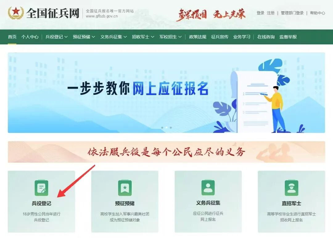 进入全国征兵网首页,尚未进行兵役登记的男青年,需点击“兵役登记进入页面进行登记。
