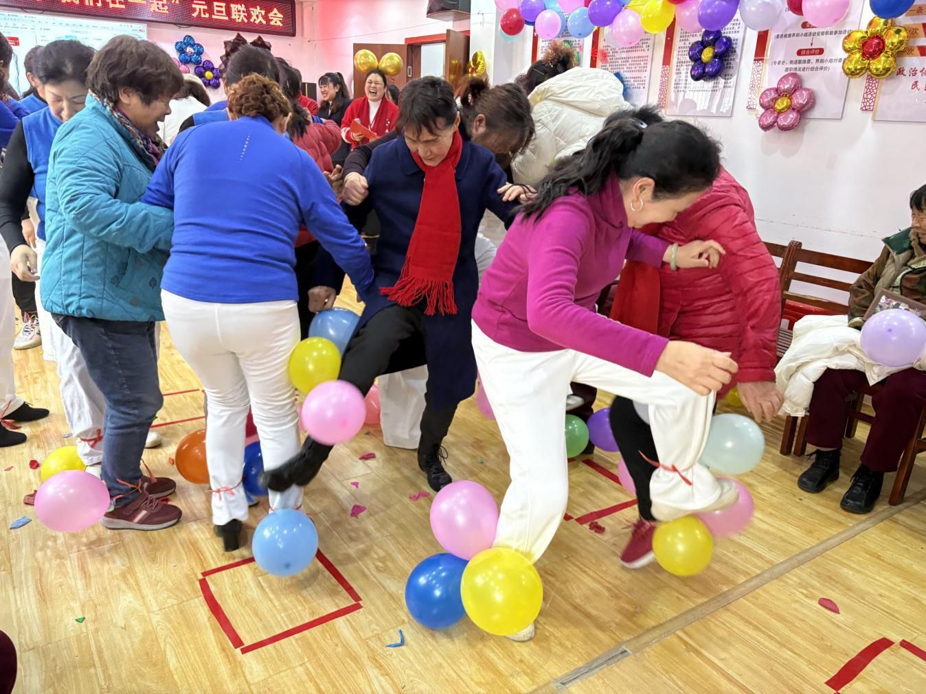 表演间隙,趣味十足的互动游戏轮番登场,成为联欢会的一大亮点。社区“欢乐大使”康老师以活泼风趣的主持风格让现场气氛持续升温。“欢天喜地响起来”游戏中,大家绑上气球,灵活走位、巧妙闪躲,既要守护自己的气球不被踩爆,又要找准时机精准出击,在“左脚踩烦恼,右脚踏福到”的呐喊中感受新年喜悦;“心之所向”考验老年朋友们的平衡感与节奏感,蒙眼踏步间尽显欢乐;“鸿运当头”“快乐接福气”“财运滚滚来”等活动各具特色,居民们踊跃参与、默契配合,笑声、欢呼声此起彼伏。