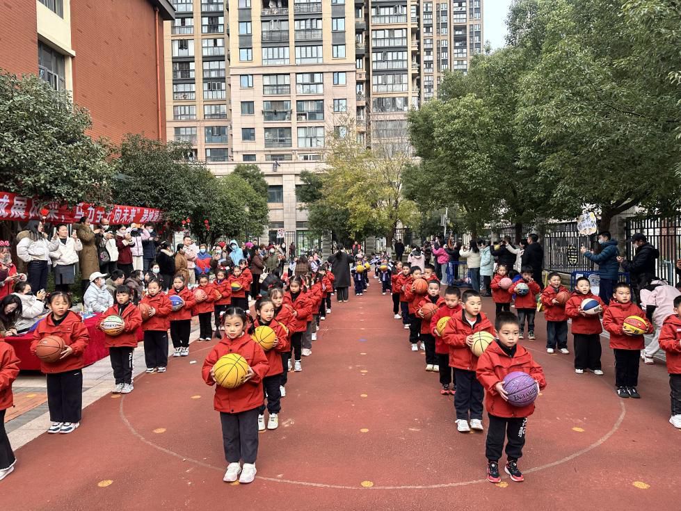 社区工作人员及20名党员志愿者分散在签到、秩序、应急、宣传四条线。幼儿园大班的孩子们展示篮球操造型,集体把篮球举过头顶,站在观众区的家长纷纷拿出手机拍照,记录瞬间。