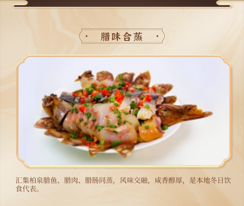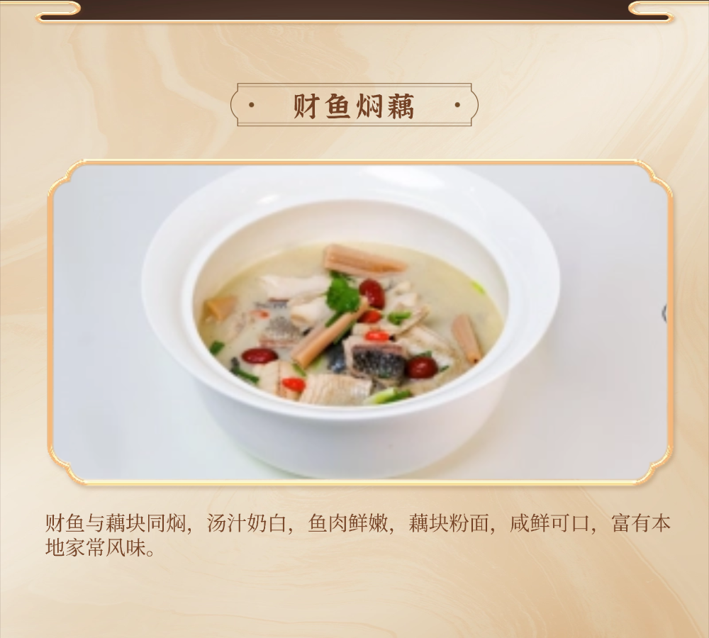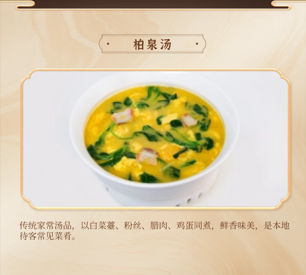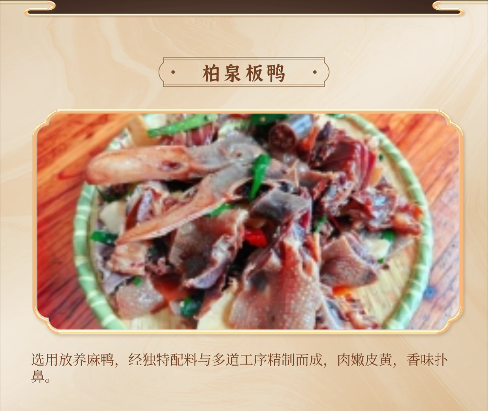 十大名菜:面蒸野菜、醋香鲈鱼、鲜汤涮鮰鱼、柏泉汤、财鱼焖藕、鳝鱼烧鸭蛋、虾渣、腊味合蒸、柏泉板鸭、风干鲫鱼;