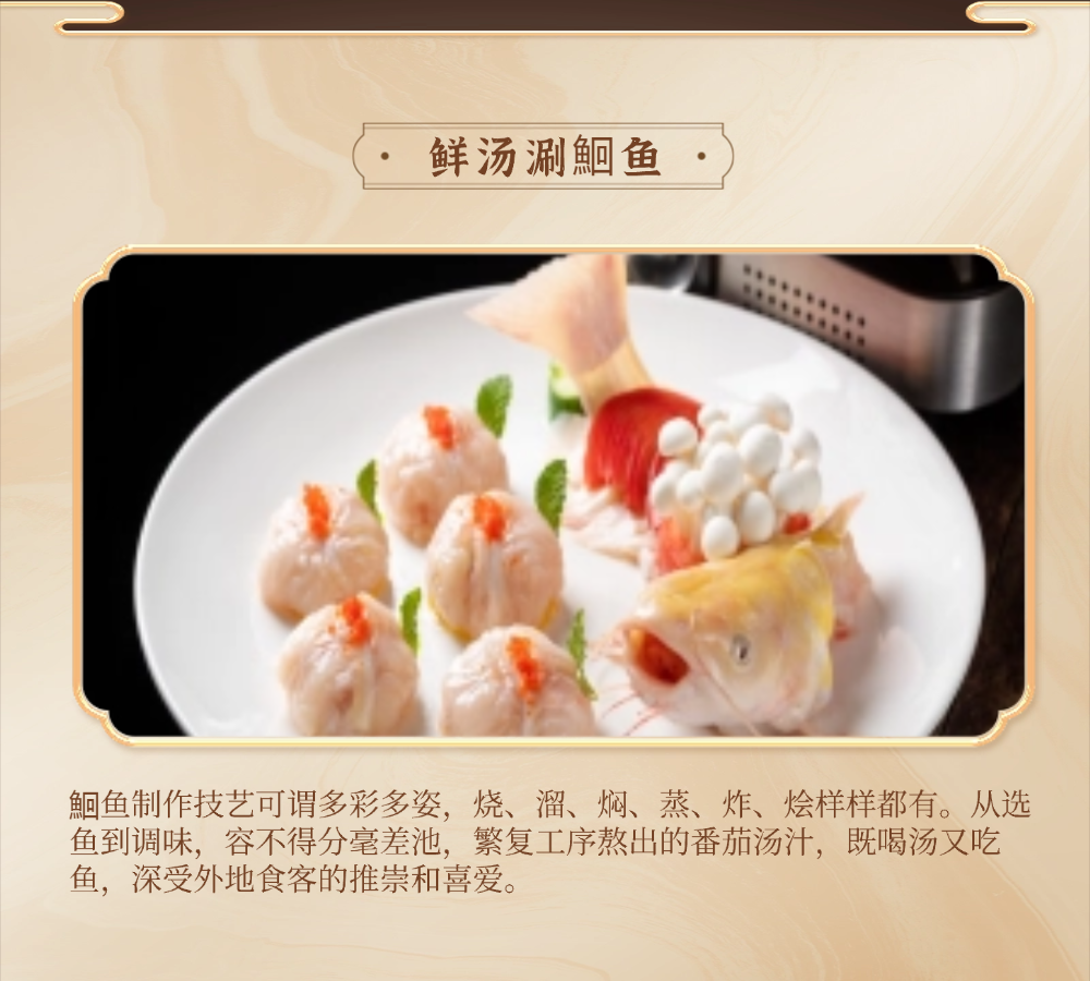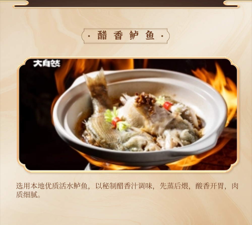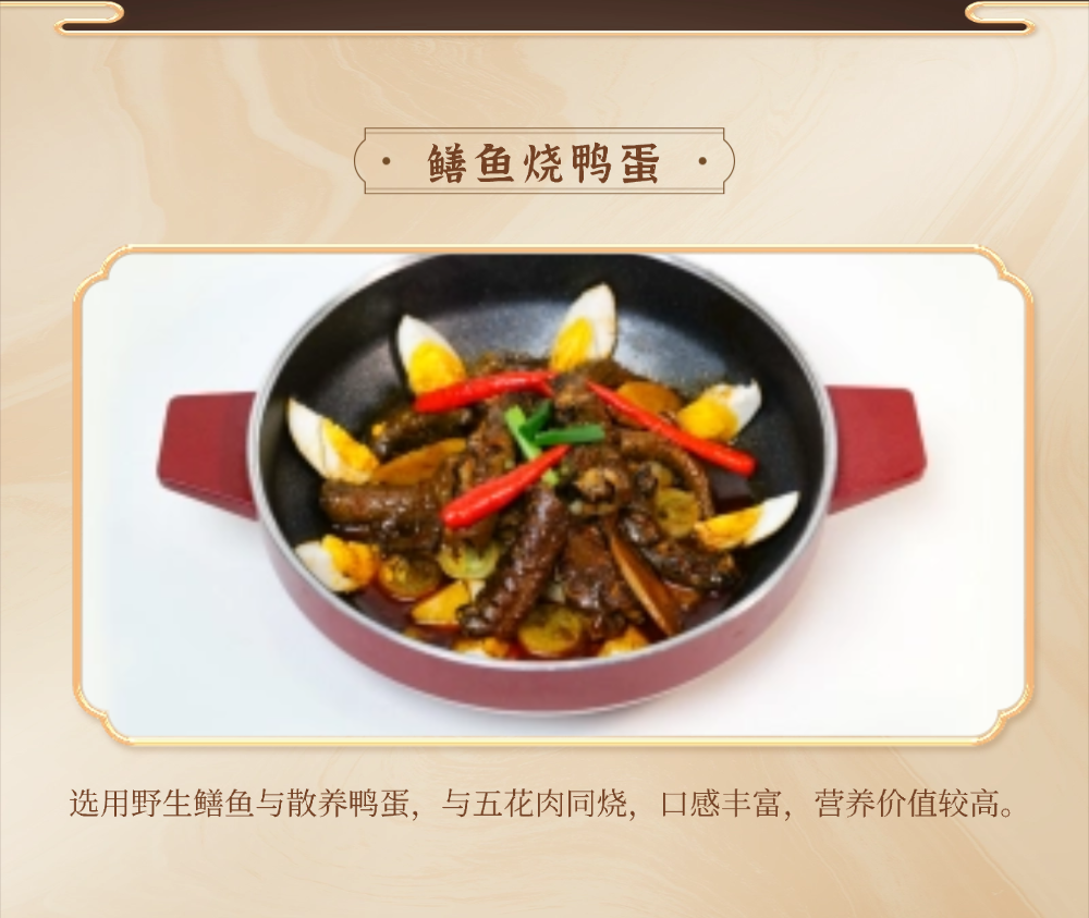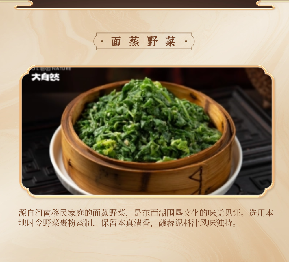 十大名菜:面蒸野菜、醋香鲈鱼、鲜汤涮鮰鱼、柏泉汤、财鱼焖藕、鳝鱼烧鸭蛋、虾渣、腊味合蒸、柏泉板鸭、风干鲫鱼;