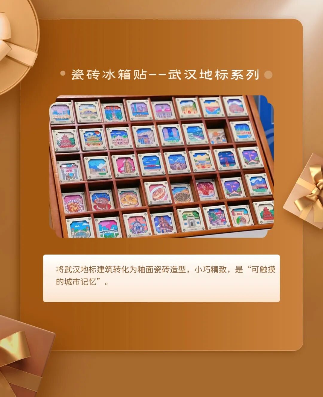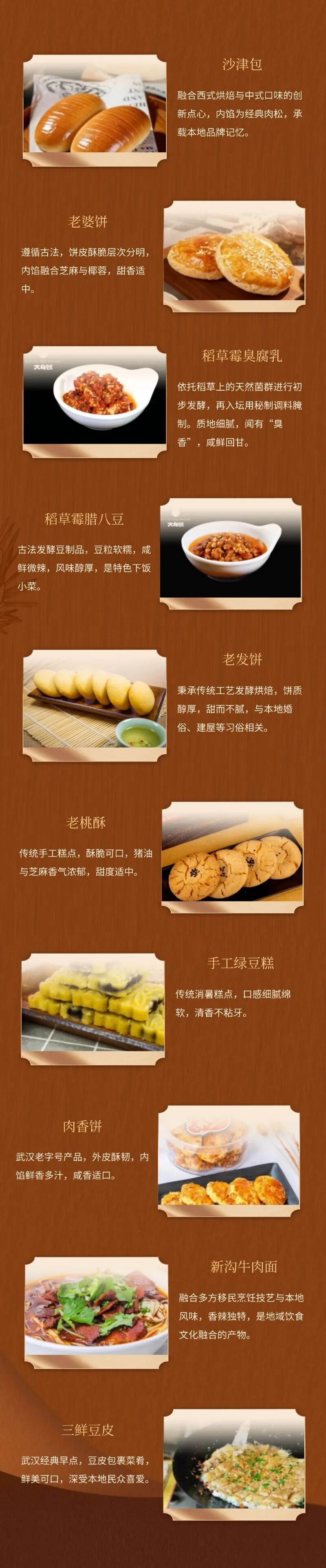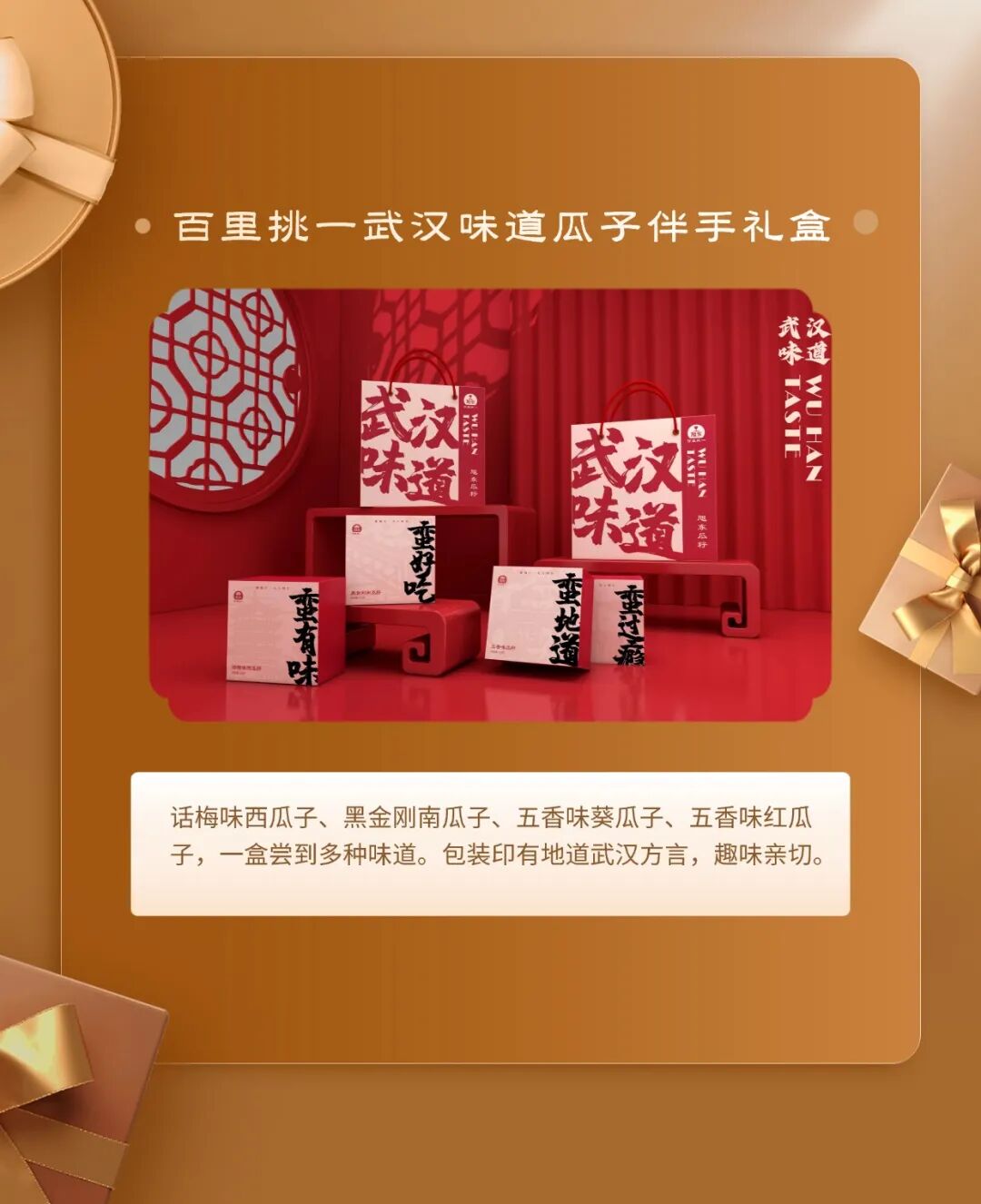 十大伴手礼:百里挑一武汉味道瓜子伴手礼盒、玫瑰花饼/鲜花饼、周黑鸭·城市伴手礼礼盒·周游武汉、武汉美食系列−毛绒盲盒冰箱贴、蔡明纬排骨藕汤、柏泉府河边腊货礼盒、大漆小葫芦挂件、柏泉龙芽、非遗缠花·梧桐叶胸针&发簪、瓷砖冰箱贴−−武汉地标系列。