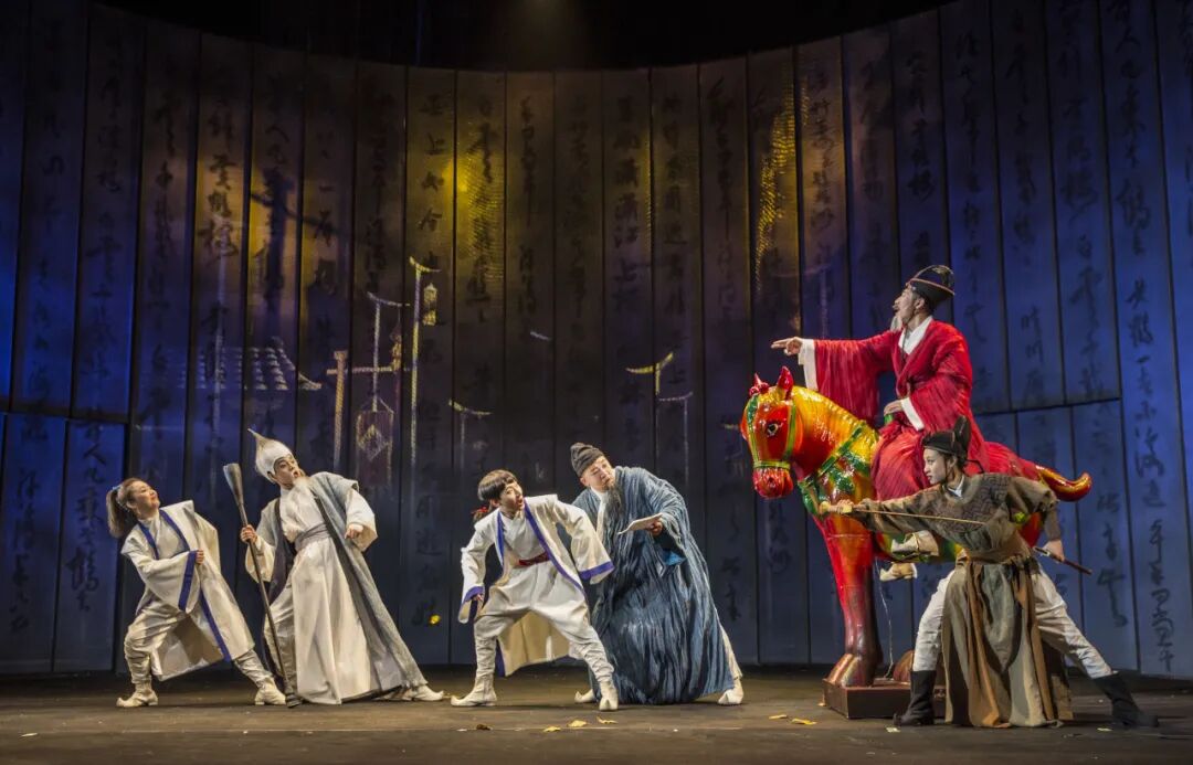 “鸟宿池边树,僧敲月下门”不再是一行单调的诗句,而是与贾岛、韩愈共同“推敲”的奇幻场景。剧目借助多媒体技术,将“黄河奔腾”、“江南烟雨”、“长安繁华”等诗词意境生动地搬上舞台。