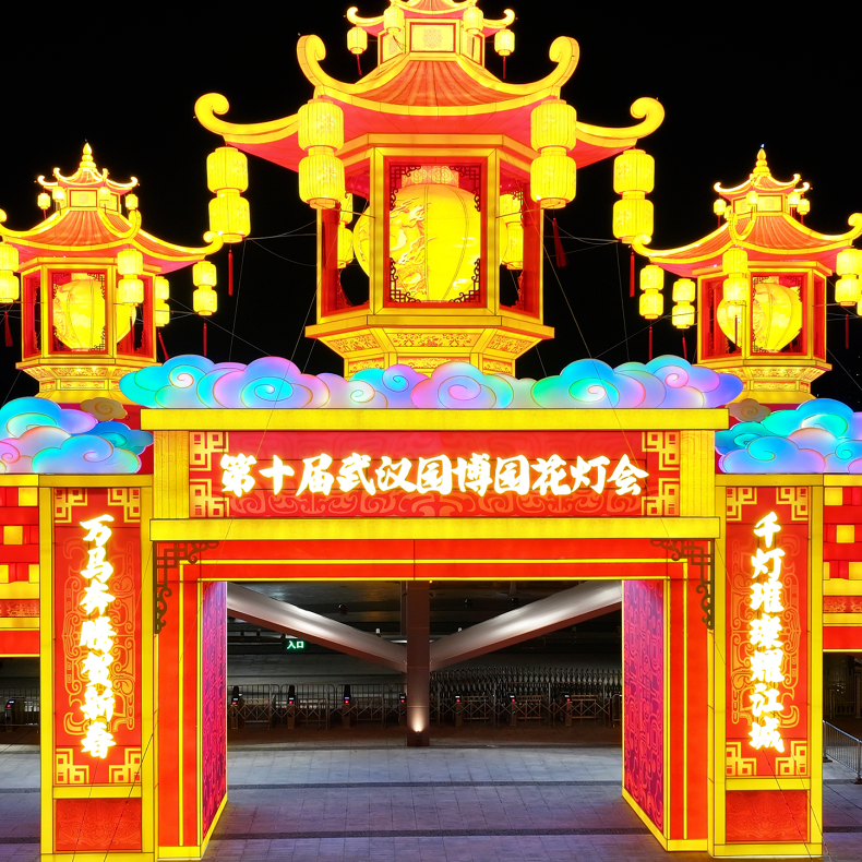 位于主入口的灯组《骏灯贺春》高22米,正是这一工艺的集中体现。灯组以骏马昂扬之姿为魂,巧妙融入传统宫灯造型,宫灯四面绘饰祥龙纹样,龙腾马跃,以走马灯形式生动诠释“龙马精神”昂扬奋发的文化意象,也契合武汉“敢为人先、追求卓越”的城市气韵。灯组整体色彩以中国红为基调,点缀璀璨金辉,既烘托新春的吉庆氛围,也寄托着对国泰民安、繁荣昌盛的美好祝愿。