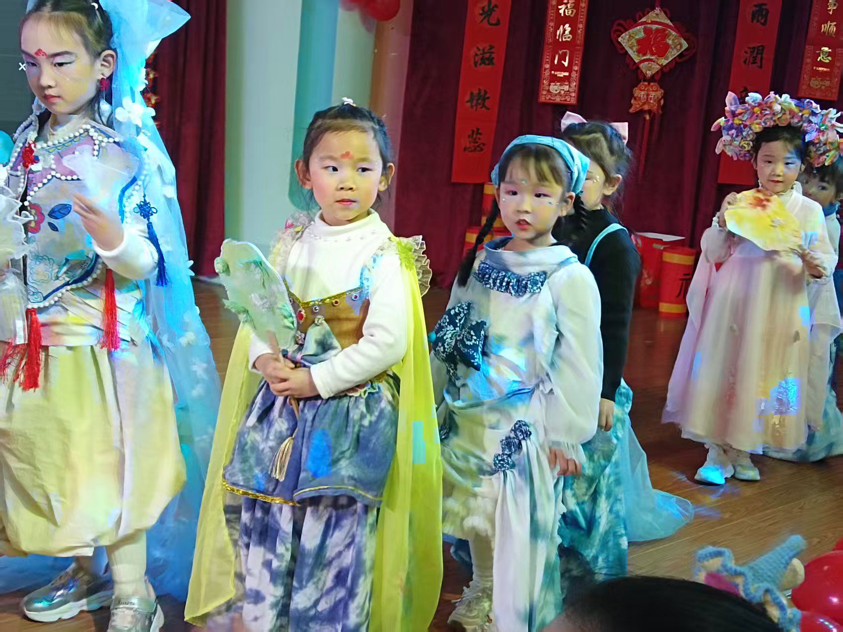 游园会在欢快的音乐声中拉开帷幕。园长妈妈为孩子们送上了最真挚的新年祝福。线语霓裳,编织先行。大三班以一场活力四射的编织艺术秀开场,瞬间点燃了全场的热情,随后一场场融合校园特色的水墨、扎染、黏土秀等闪亮登场,孩子们矫健的猫步与纯真的笑脸交相辉映,音体室的家长们目不转睛,连连称赞。