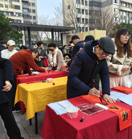 现场最热闹的环节,当属“墨香迎新春”写对联送祝福。社区书法爱好者、退休教师与党员们组成“先锋送福队”,以笔墨传情、以春联寄意。“一元复始呈兴旺,万象更新启宏图”等一副副寓意美好的春联和福字跃然纸上,既饱含着对家国兴盛的祝福,也传递着邻里守望的温情。居民们有序排队领取,小朋友们也在“邻里体验区”兴致勃勃地学写春联,处处洋溢着温馨和谐的浓厚氛围。