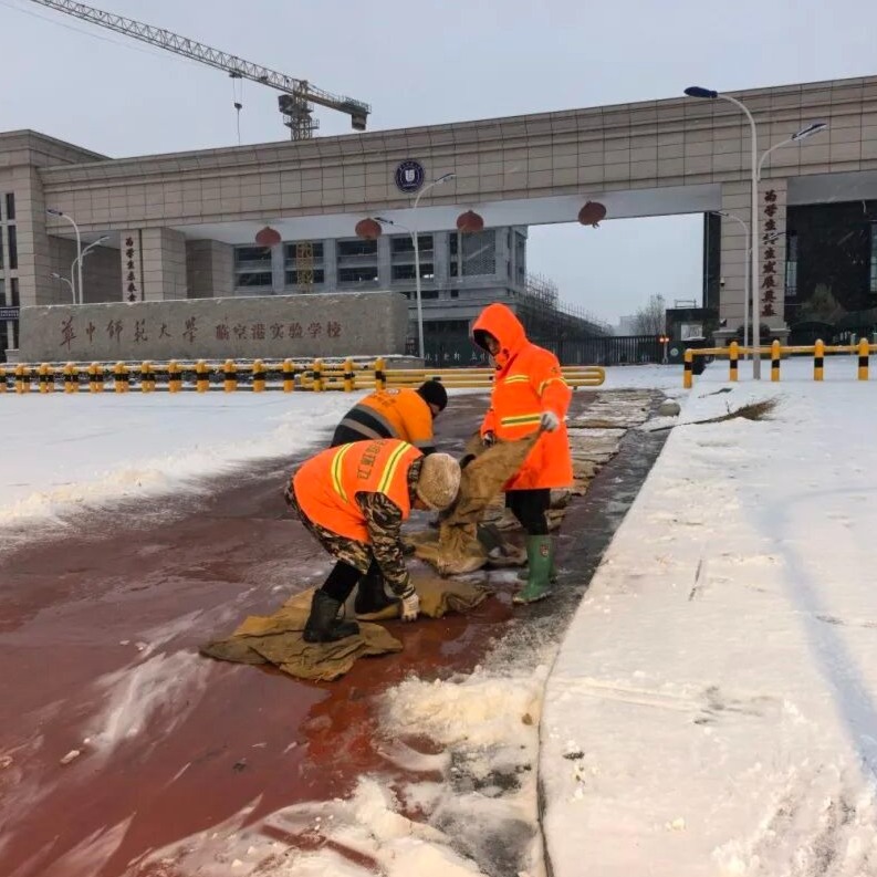 学校周边是此轮除雪的重点。20日早晨7点,在华中师范大学临空港实验学校门口,径河街环卫工人和执法中心的队员们,正弯着腰铲雪。“径河街环卫队长黄彬一边铲雪一边介绍,先用雪铲清理金北一路主路上的积雪,再转战至机械进不去的人行道,全靠人工一锹一锹清理。