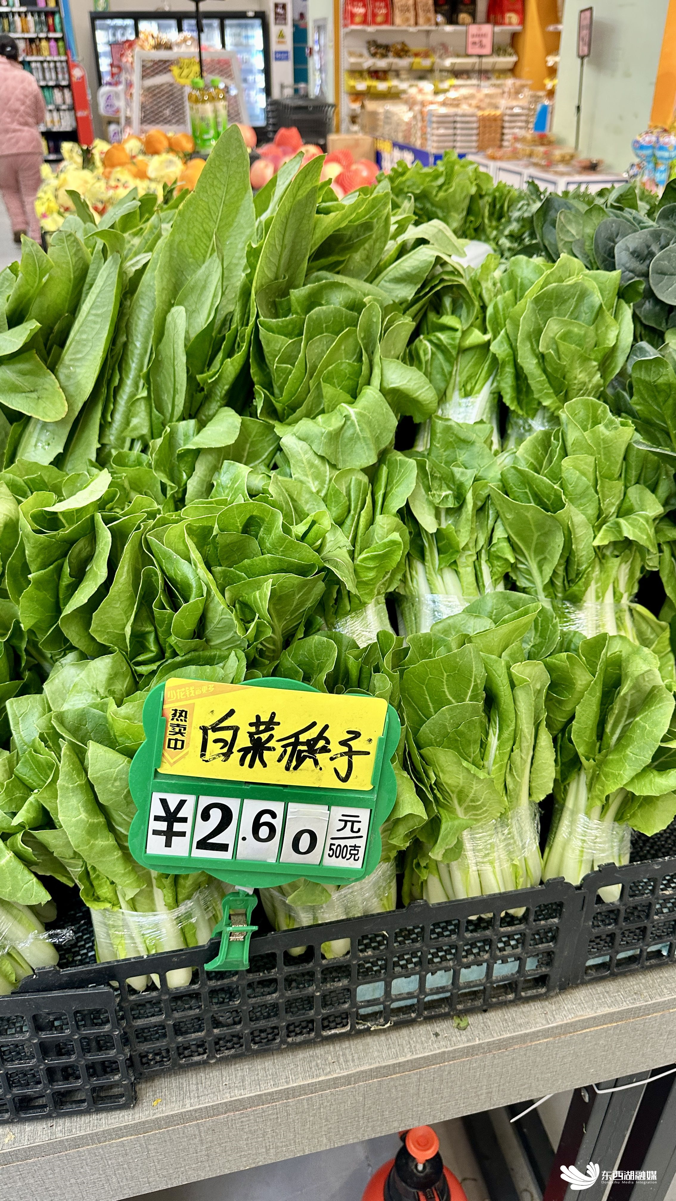 位于金北一路的农投惠万家精品超市内,蔬菜区陈列着大白菜、韭菜、辣椒、番茄、甜豆、毛豆、大蒜等近百个品种。收银台旁的特价区尤为醒目,白萝卜0.98元/斤、红菜薹1.28元/斤、大包菜1.5元/斤等近十种低价菜吸引市民有序选购。