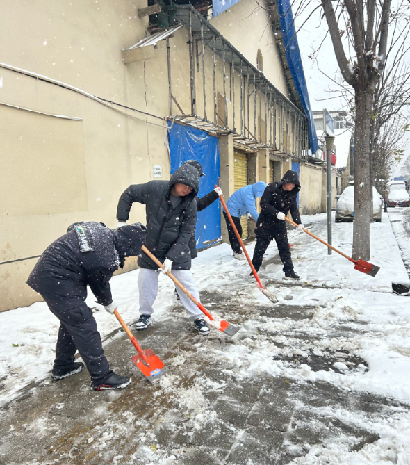 物业公司迅速启动应急处置预案,组建专项作业队在各服务小区同步开展除雪行动,按照“先主后次、先通后净”思路,采用“铁锹破冰+扫帚清雪”模式清理主干道、单元门口等区域,在易滑部位撒布融雪剂、铺设防滑草垫并设置警示标识,协助行动不便业主出行,累计出动200余人次,4小时内实现所有小区主干道、人行通道全畅通。