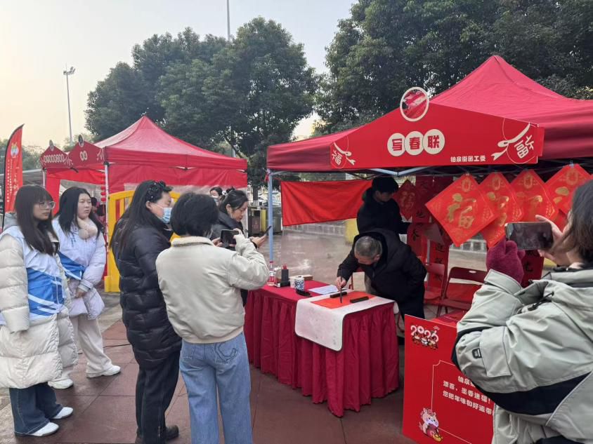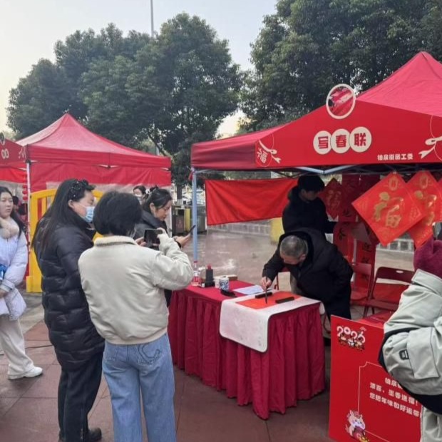 1 月 24 日上午,团区委主办的 “年味有 FUN” 寒假嘉年华活动在东西湖区中心广场火热启幕,柏泉街团工委代表新港苑社区设立的写春联摊位,凭借满满的传统韵味与暖心祝福,成为现场最具人气的打卡点之一。