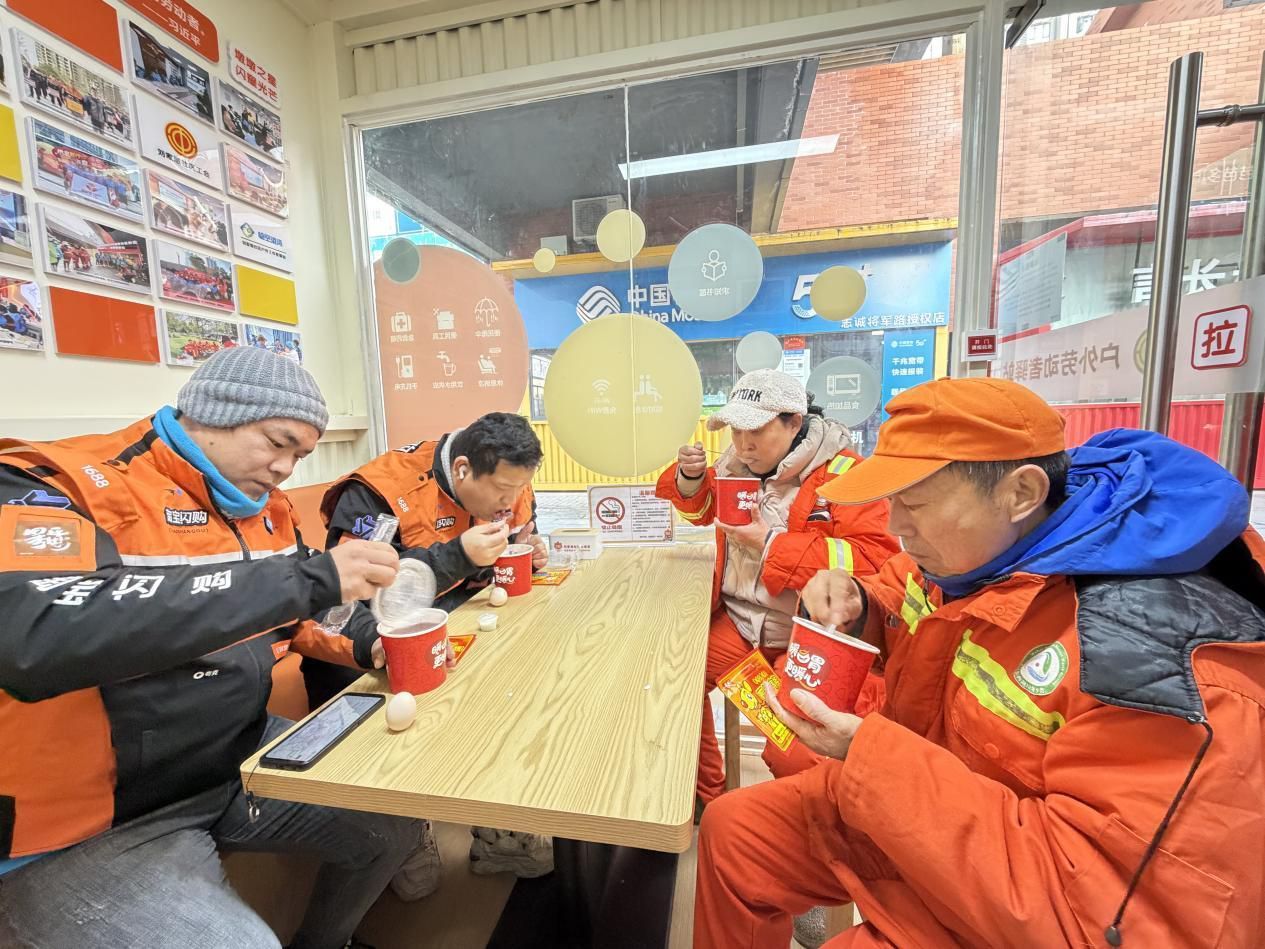 1月23日,将军路街刘家墩社区工会在壹站城“壹起来”暖新微驿站,为外卖员、环卫工人等户外劳动者送上了一份特别的冬日温暖。一份份热腾腾的腊八粥与煮鸡蛋,驱散了清晨的寒意,也传递着社区对一线劳动者的诚挚敬意与节日问候。
