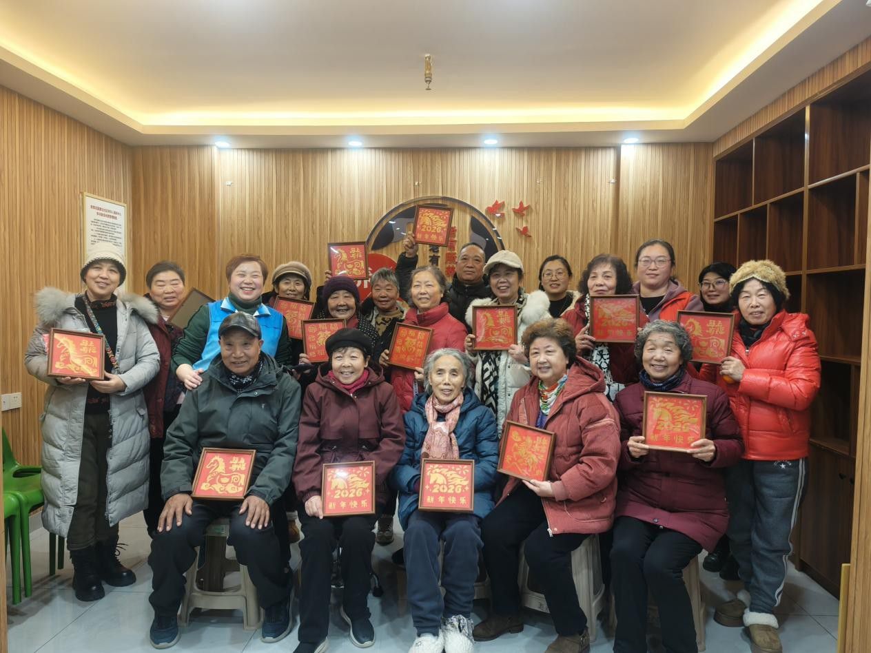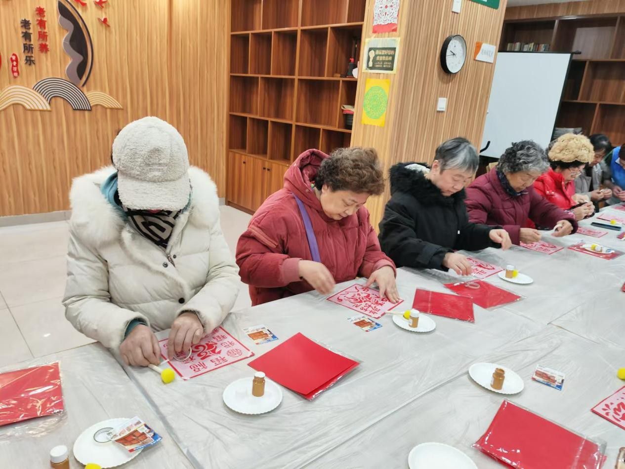 活动当天,工作人员早早来到现场,备好拓印工具、红色宣纸、吉祥纹样模板以及热茶、点心、腊八特色小食,为老年朋友们打造了舒适惬意的活动环境。活动伊始,志愿者现场讲解腊八节的起源、传统习俗及拓印技艺的简单技巧,手把手指导大家进行“福迎腊八”拓印创作。老人们手持拓包,蘸取颜料,轻按慢拓,在红色宣纸上印出一个个寓意吉祥的福字、马年吉祥纹样,每一个作品都饱含着大家对新年的美好期许。大家相互交流拓印心得,切磋手法,现场欢声笑语不断,指尖的创意与传统的美好相融,一张张红彤彤的拓印福字,既定格了民俗之美,也让老人们在动手体验中收获了成就感与乐趣。