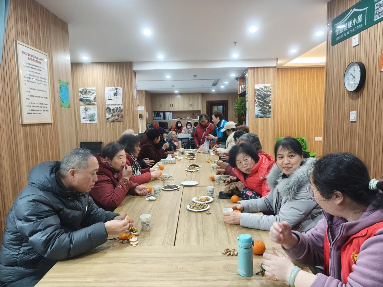 拓印环节结束后,邻里茶话会温情开启。工作人员为老人们斟上温热的花茶,摆上精心准备的点心与腊八特色小吃,老人们围坐一堂,畅所欲言。大家从腊八节的熬粥、腌蒜习俗,聊到年货的准备,从邻里间的暖心小事,谈到社区生活的点滴变化,你一言我一语,分享着自己的年俗故事,诉说着邻里情谊。志愿者们认真倾听,适时互动,为老人们添茶递水,让老人们在轻松愉悦的氛围中感受到了社区大家庭的温暖。