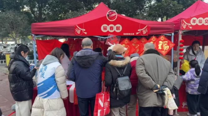 新春将至,年味渐浓。1 月 24 日上午,团区委主办的“年味有 FUN” 寒假嘉年华活动在东西湖区中心广场热闹启幕,柏泉街团工委代表新港苑社区设立的写春联摊位,凭借满满的传统韵味与暖心祝福,成为现场最具人气的打卡点之一,让市民在笔墨书香中提前感受新春的喜庆氛围。