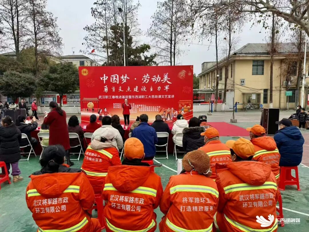 1月27日下午,东西湖区将军路文化广场上人头攒动,由武汉市总工会指导,东西湖区委宣传部、区委社会工作部、区总工会、将军路街工会等单位联合承办的“中国梦·劳动美——勇当支点建设主力军”武汉职工春晚进基层暨东西湖职工大思政课文艺宣讲活动正如火如荼举行。