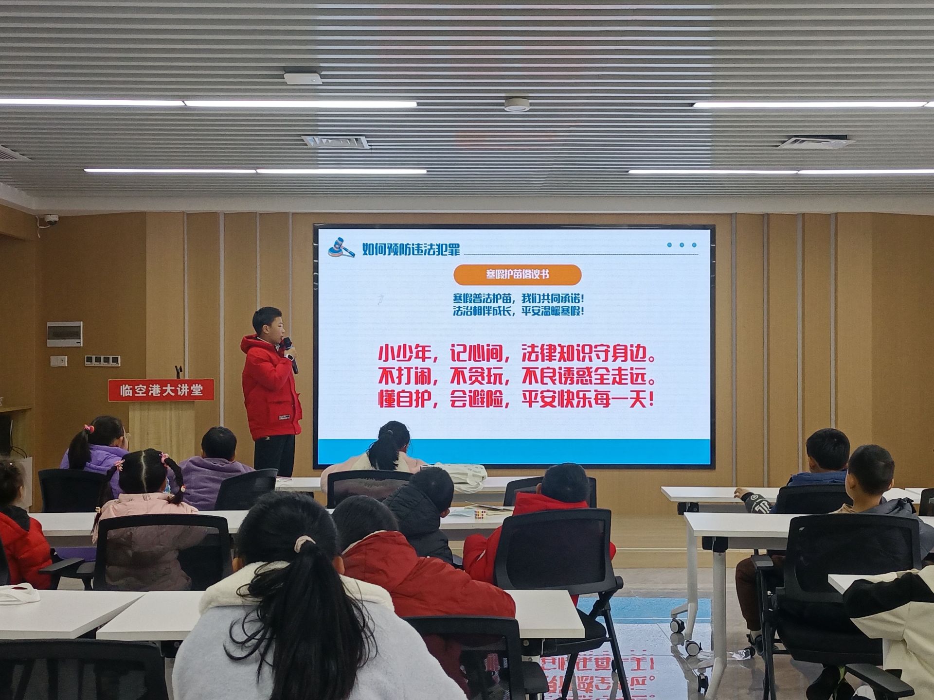 活动紧扣寒假生活实际,聚焦青少年身边的安全与法律问题。课堂上,区司法局普法宣传员围绕基本法律常识、法律与我们的关系、案例分析、如何预防违法犯罪等内容展开,运用通俗易懂的语言,通过普法公益短片、有奖问答互动等方式,巧妙结合《中华人民共和国未成年人保护法》《中华人民共和国预防未成年人犯罪法》中的核心条款,穿插真实鲜活的典型案例,将抽象的法律条文转化为孩子们能够理解的具体情境,使青少年在轻松愉快的氛围中学习法律知识,理解法律在保护自身权益中的重要作用。为进一步深化学习效果,活动现场发起了“寒假普法护苗”倡议,在老师的带领下,全体青少年齐声宣读倡议书,稚嫩而坚定的声音回响在活动室,承诺将自觉遵守法律法规,远离不良行为与不良信息,争做明理守法、勇于担当的“法治小卫士”。