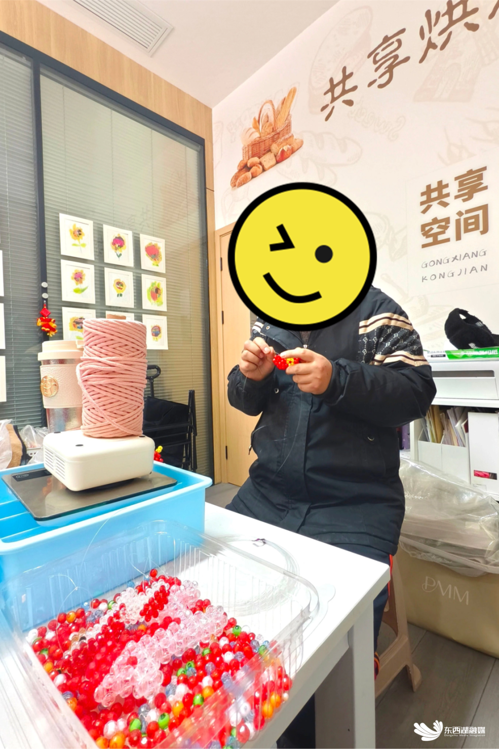 在金银湖花城社区党群服务中心的一间咖啡屋里,空气弥漫着咖啡豆的醇香。午后的阳光透过玻璃,洒在两位专注的青年身上。花花和梓健正低头,小心翼翼地将一颗颗彩色珠子串起。他们的动作或许比常人慢一些,神情却无比认真。