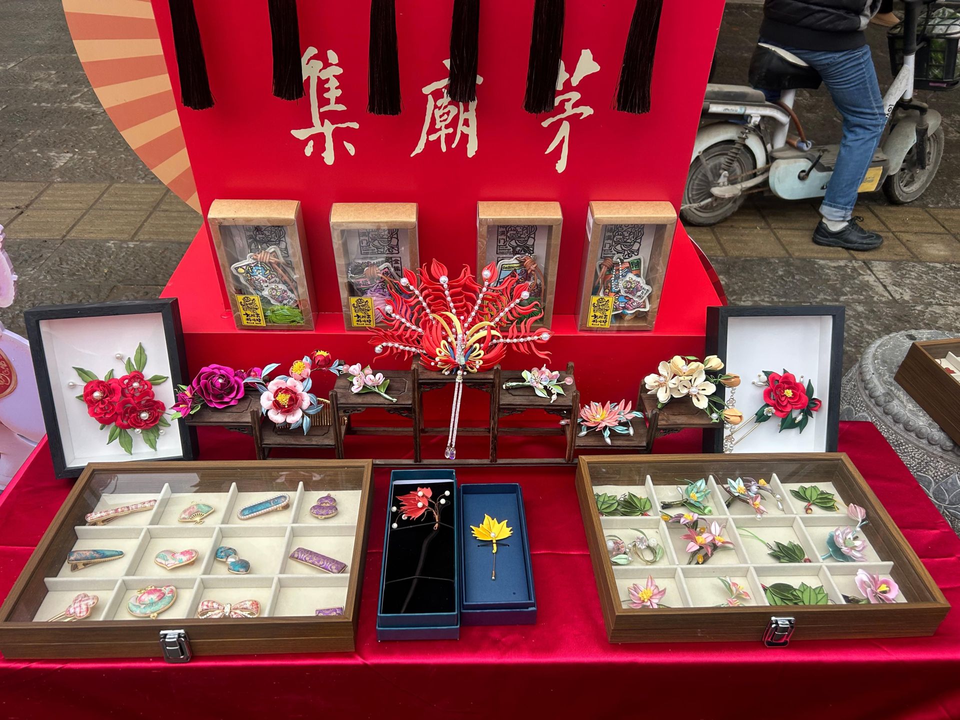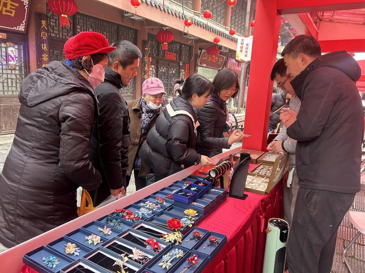 活动现场,将军路文旅公司展位前人头攒动。非遗匠人带来的缠花胸针、发簪、手链、耳饰等手工文创饰品琳琅满目、精巧别致,吸引大批游客驻足观赏、争相选购。其中,获评“东西湖十大伴手礼”的湖北缠花·梧桐叶胸针与发簪,凭借精湛的传统工艺和深厚的文化底蕴惊艳亮相,成为现场爆款好物。在推广非遗文创的同时,工作人员还向游客们详细介绍将军路文旅特色资源与便捷交通路线,热情邀约游客走进将军路,深度体验“吃住玩购”一站式文旅乐趣。