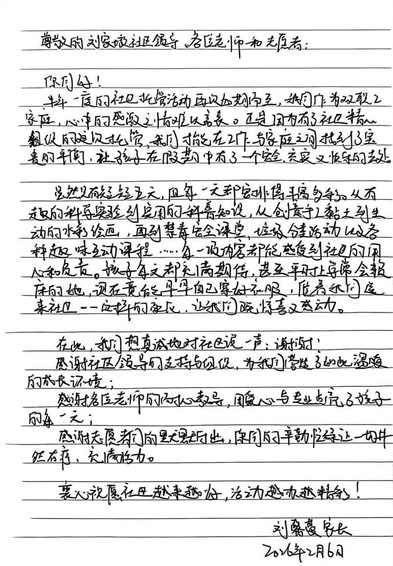 活动结束后,家长们的感谢在微信群中刷屏。更有家长用心写下了感谢信,纸短情长,充满了对社区办实事、办好事的肯定。