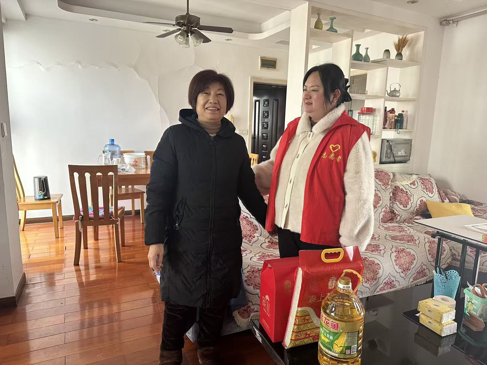 对身患重疾的困难群众,工作人员认真倾听其生活诉求与实际困难,鼓励保持乐观心态,并将上米、油等过节生活物资。