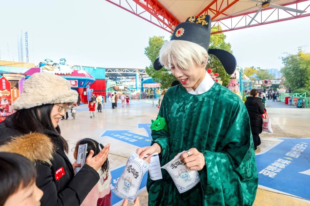 除了看,还能玩着“赚钱”。园区推出“鲸喜银票”玩法。在园内11处非遗市集,完成游戏、打卡集赞、有奖竞猜等趣味任务,即可轻松赚取“银票”兑换新春好礼。带着孩子边玩边“挣钱”,乐趣加倍。