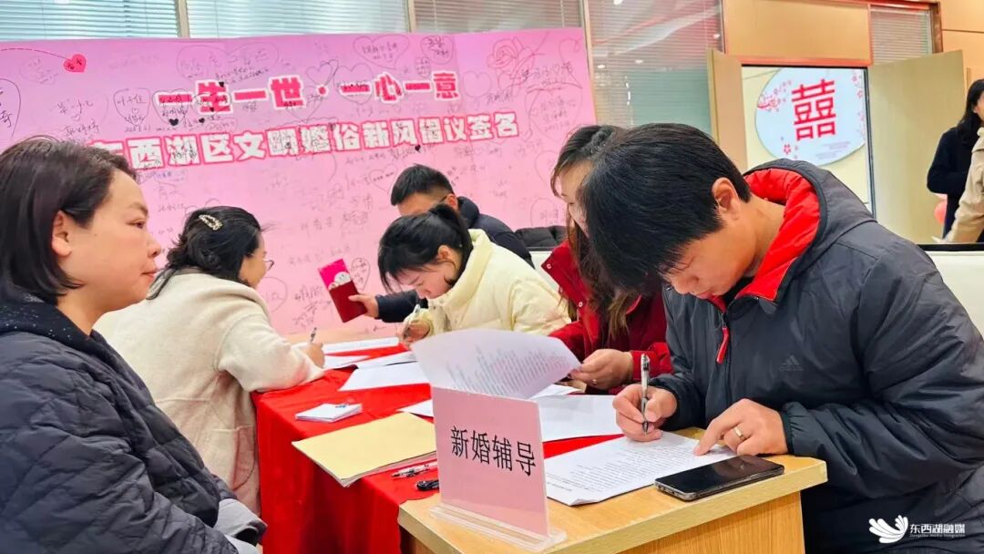 在庄严的颁证厅内,一场场简约而神圣的颁证仪式正在温馨举行。在颁证员的引导下,新人们齐声宣读结婚誓言,誓言轻许,承诺如山。工作人员为每对新人递上《文明婚俗倡议书》,许多新人在领证后,自发来到“抵制高额彩礼、拒绝低俗婚闹、倡导喜事简办”的签名墙前,郑重地写下自己的名字,以实际行动响应文明婚俗号召。