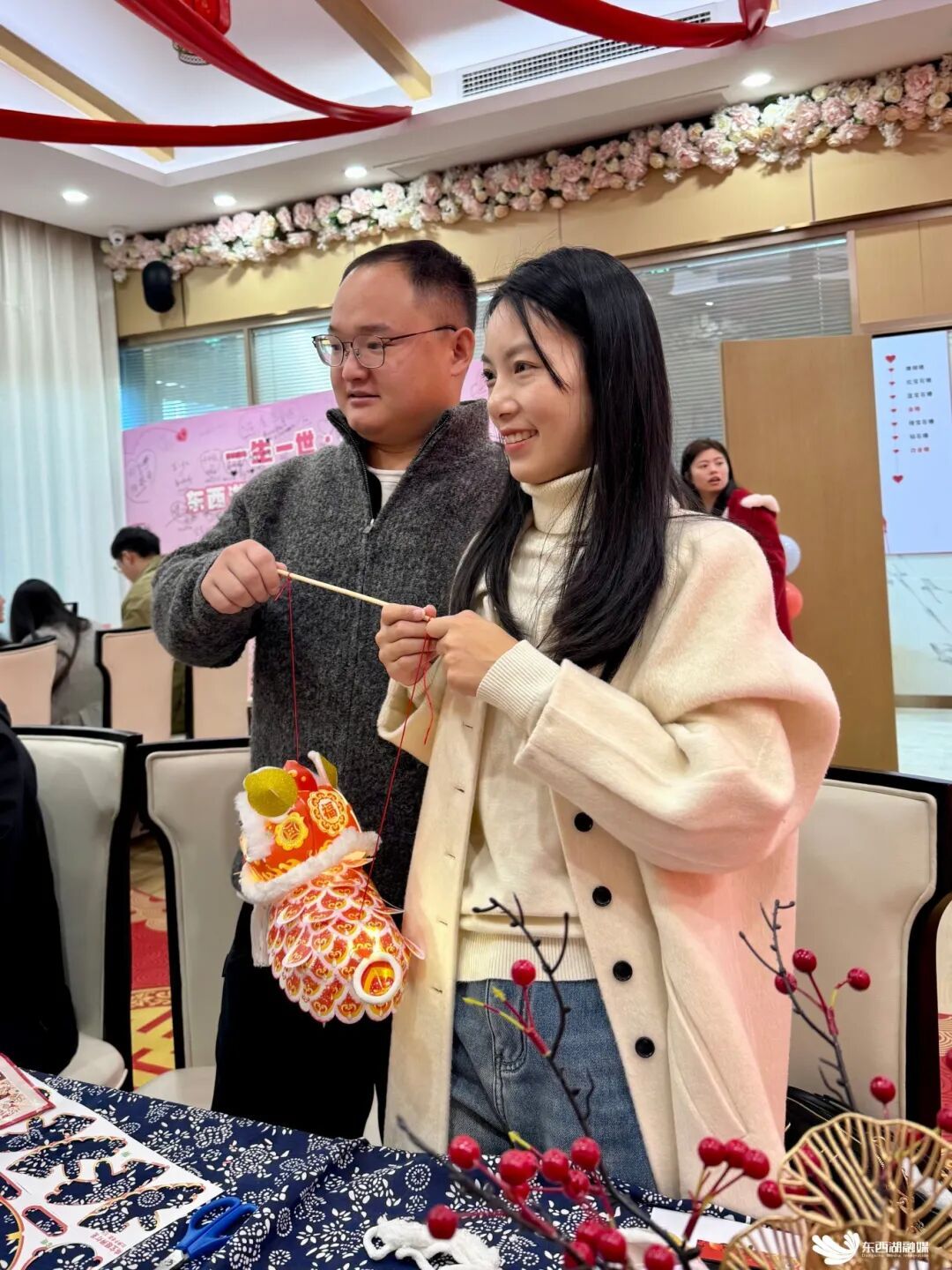 来自径河街的新娘詹必钦和新郎曹祎是当天较早抵达的一对。在“家风传承”主题互动区,两人兴致勃勃地携手完成了一盏精美的醒狮灯笼。新娘詹必钦一边细心整理灯笼穗子,一边笑着对记者说:“这个活动特别有意义,是我们俩一起合作完成的第一件‘家庭作品’,寓意吉祥和谐、家业兴旺,比单纯的排队等候有趣多了。”
