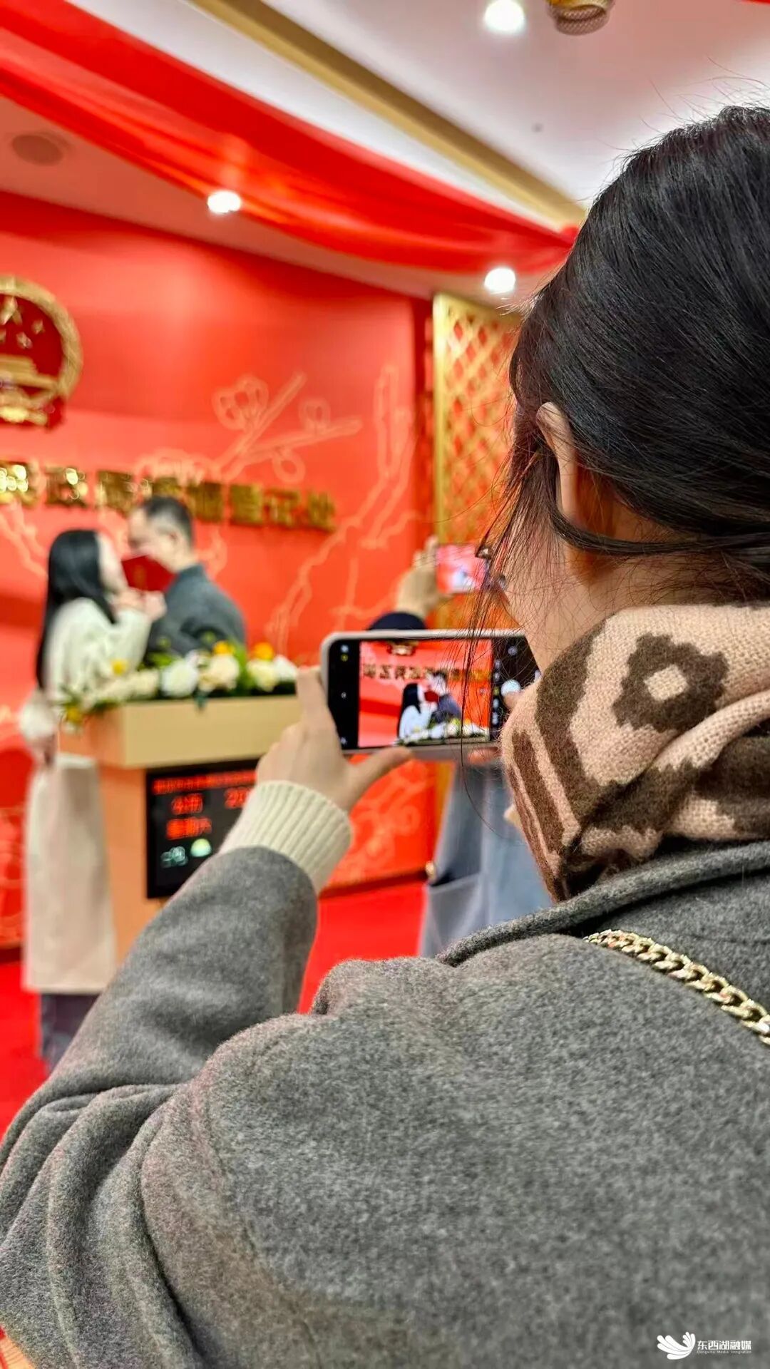 市民欧阳东方与妻子在一个月前就通过“鄂汇办”APP完成了线上预约。当天,欧阳东方还悄悄准备了鲜花,直到下车时才为妻子送上这份惊喜。“领完证,我们先两个人单独庆祝一下,晚上再跟家人一起聚会。”谈及对今天的期待,他指了指颁证厅的方向:“最期待的还是颁证拍照环节,我们想多留些有纪念意义的照片。”